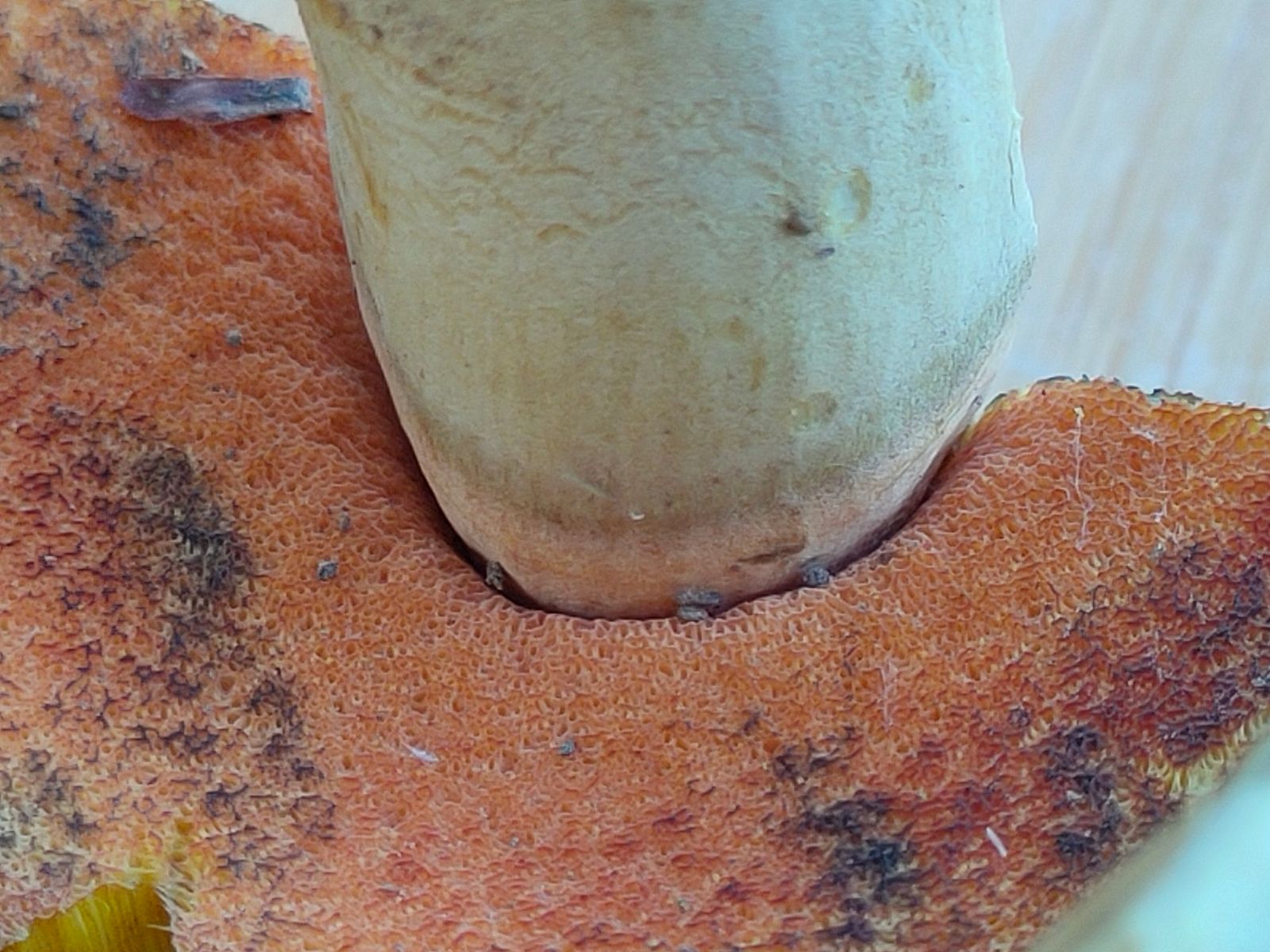Die Röhrenmündungen sind jung gelb später orange, feinporig und am Stiel ausgebuchtet angewachsen. Die Röhren selbst sind gelb und schwer vom Röhrenboden zu entfernen und blauen nicht bis kaum.