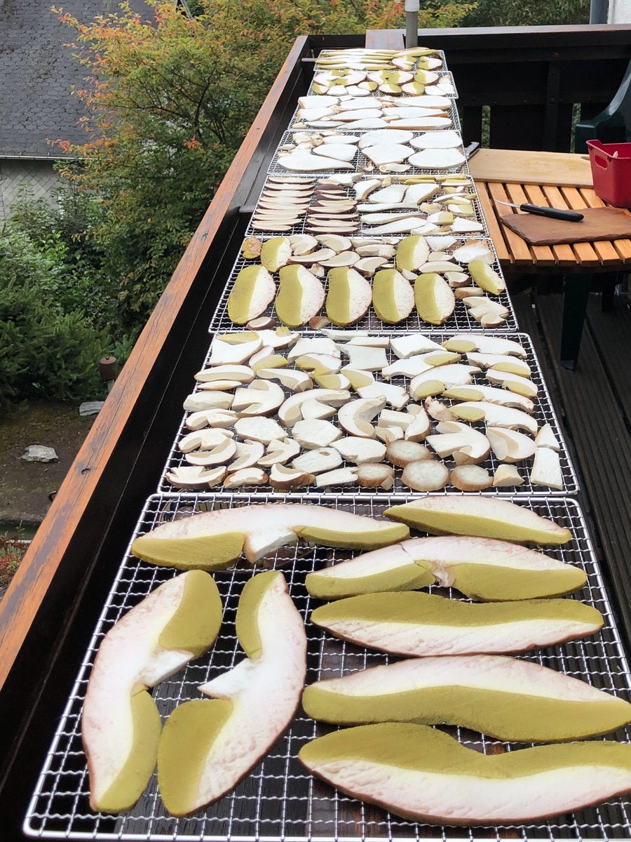 Dieses Jahr habe ich schon mehrere Pilze erfolgreich an der Luft getrocknet, indem ich sie einfach auf die Gittereinsätze vom Dörrgerät gelegt und an einer gut belüfteten, warmen Stelle aufgestellt habe. Wenn man die Scheiben sehr dünn macht, hält sich auch das Schimmelrisiko in Grenzen. Dafür wird man mit einem tollen Aroma belohnt und muss sich keine Sorgen um eventuell zu hohe Temperaturen im Dörrgerät machen.