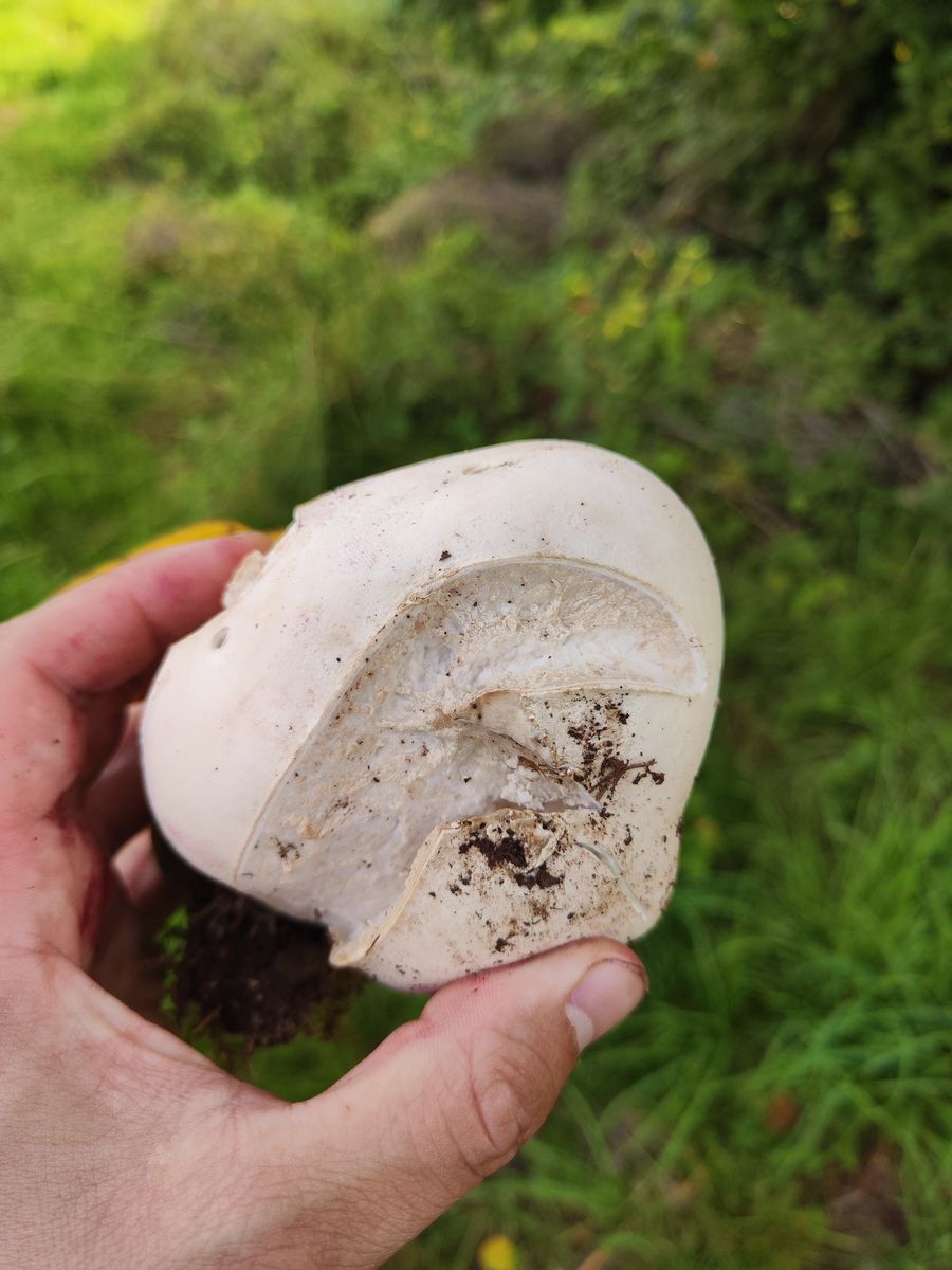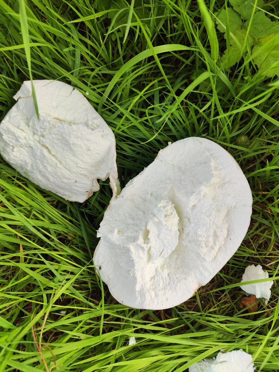 5. Das sollte ein Riesen-Bovist sein. Keine Ansätze von Lamellen im Innern, reinweiß, kein Stiel. Der aufgebrochene hatte leider schon so dort gelegen, hat sicher jemand als Fußball missbraucht...
