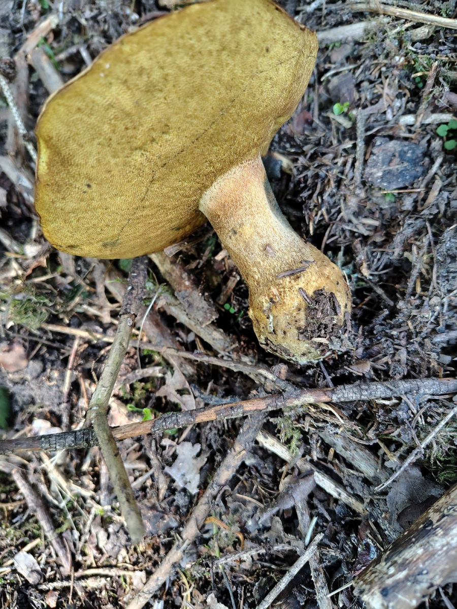 Ich fand heute am Badesee noch einen merkwürdigen Röhrling. Bei Fichte/Tanne/Eiche auf oberflächlich stark angesäuertem Kalk. Etwas älter und ich habe ihn auch im Habitat gelassen daher ist wahrscheinlich eine sichere Bestimmung nicht möglich aber vielleicht hat wer eine Einschätzung. Sehr feines, gelbes Netz am Stiel, Geschmack mild. Röhren gelb mit ganz leichtem braunrötlichem Schimmer. Druckstelle außen am Stiel ziemlich schnell tintenblau verfärbend.