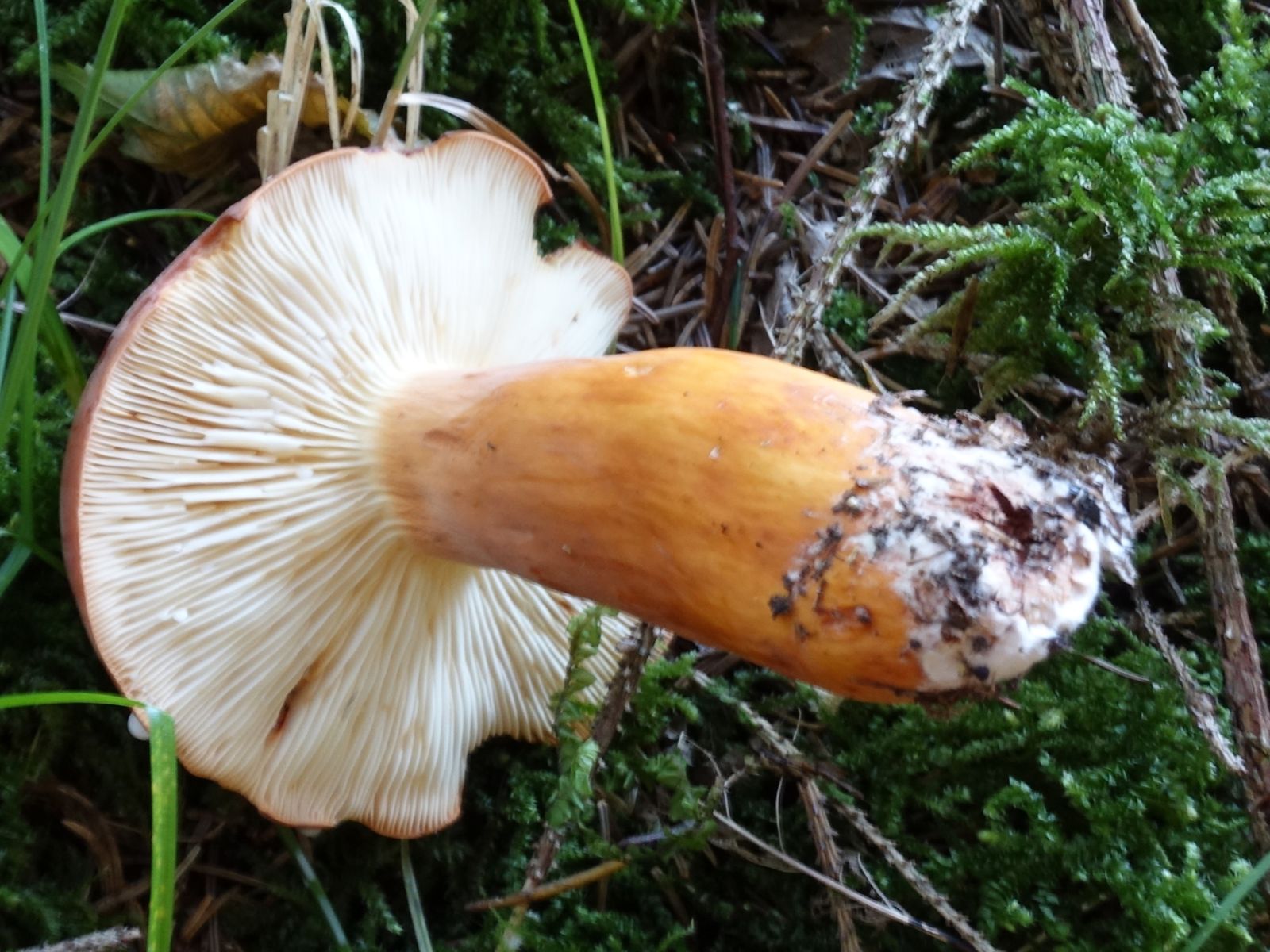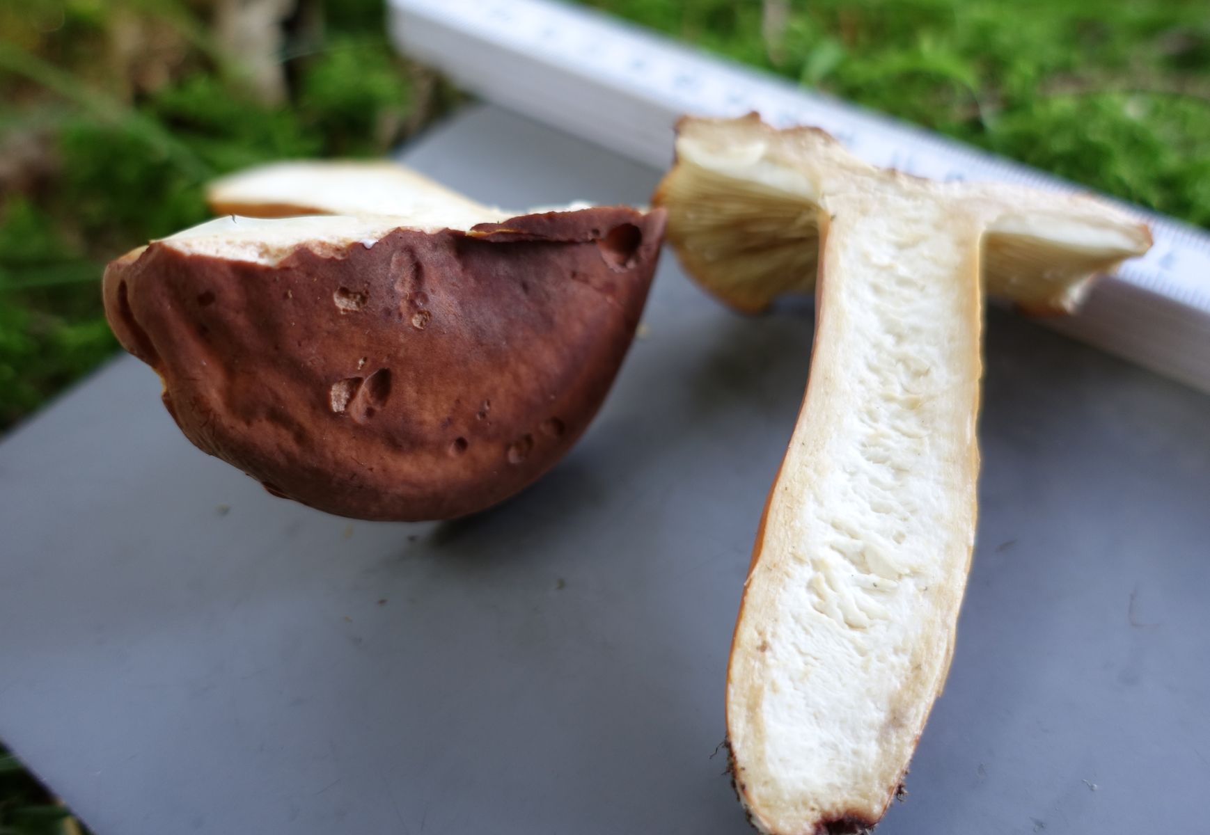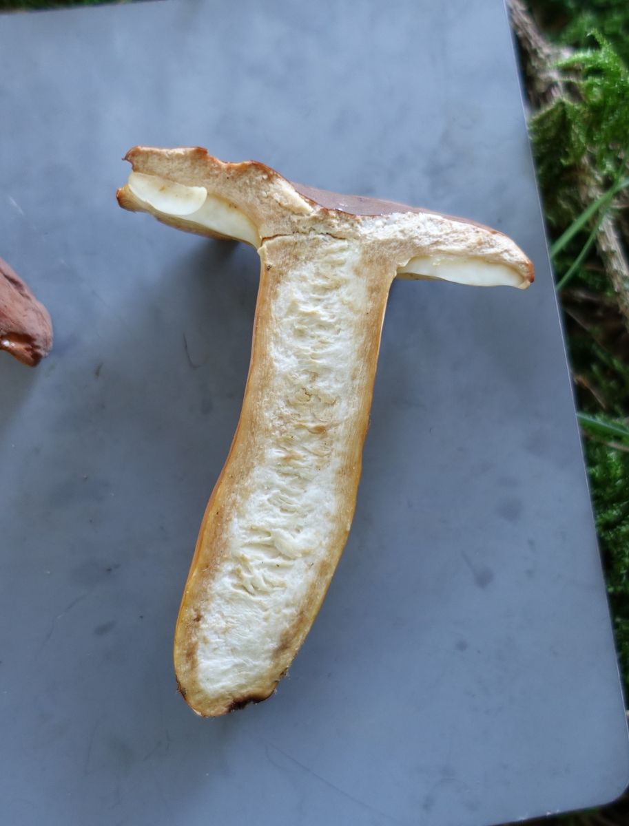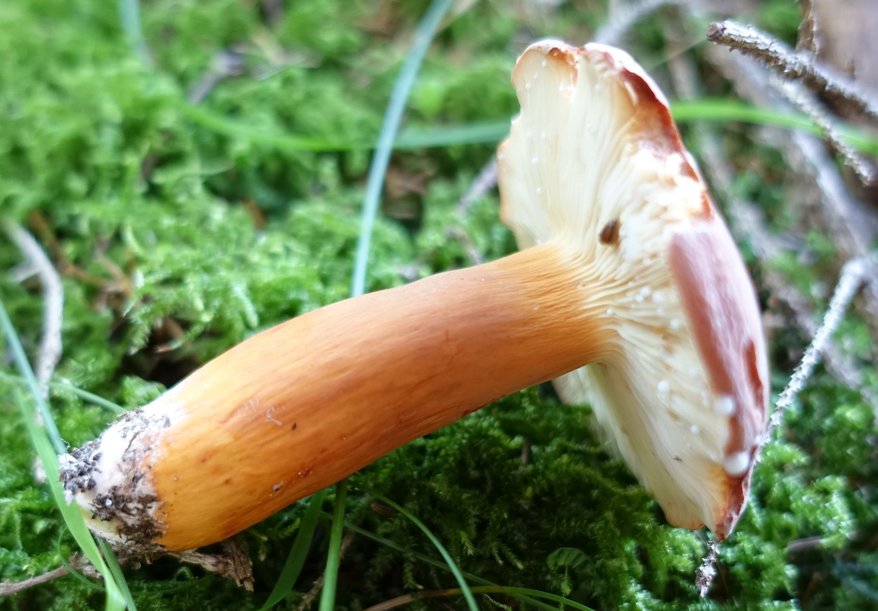 Bild 8 FK1: einige Minuten nach dem Schnitt. Stielrand wird dunkler, bräunliche Verfärbungen auch im Hutbereich. Die Konsistenz in der Stielmitte nennen ich als wattig.