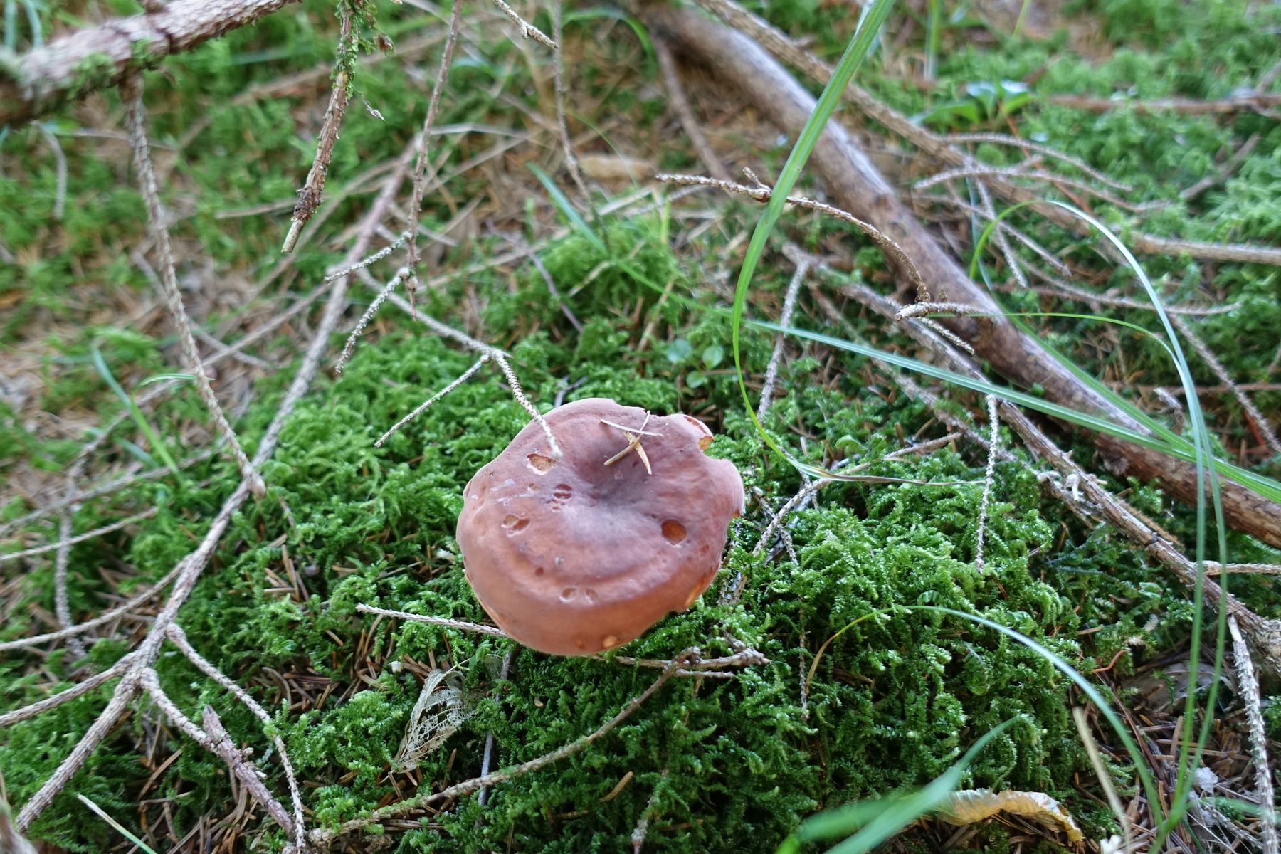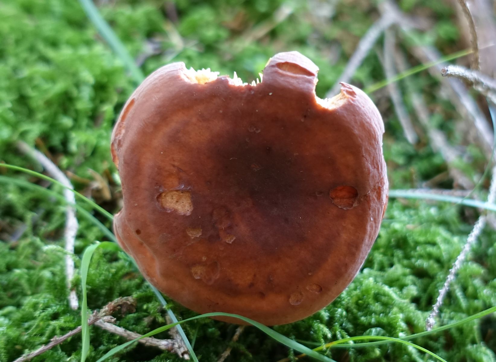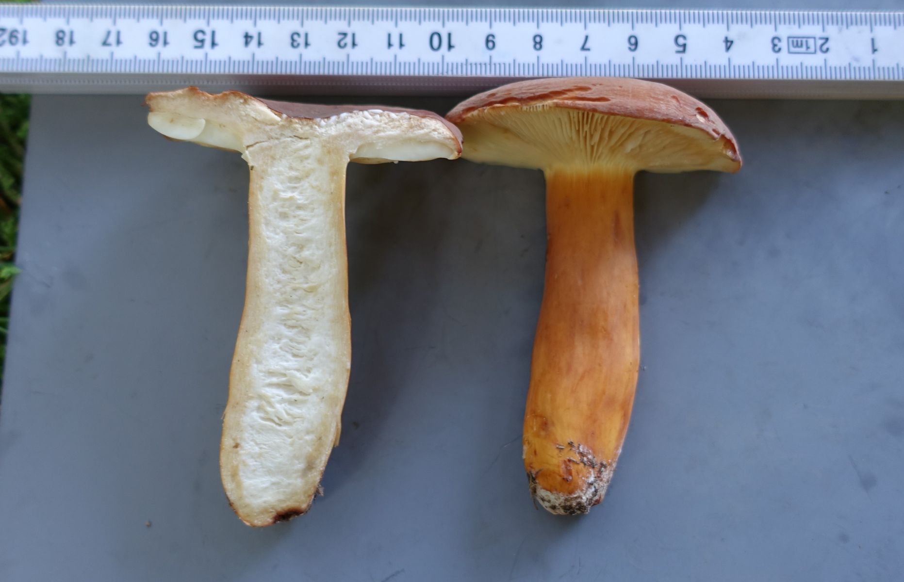 Bild 8 FK1: einige Minuten nach dem Schnitt. Stielrand wird dunkler, bräunliche Verfärbungen auch im Hutbereich. Die Konsistenz in der Stielmitte nennen ich als wattig.