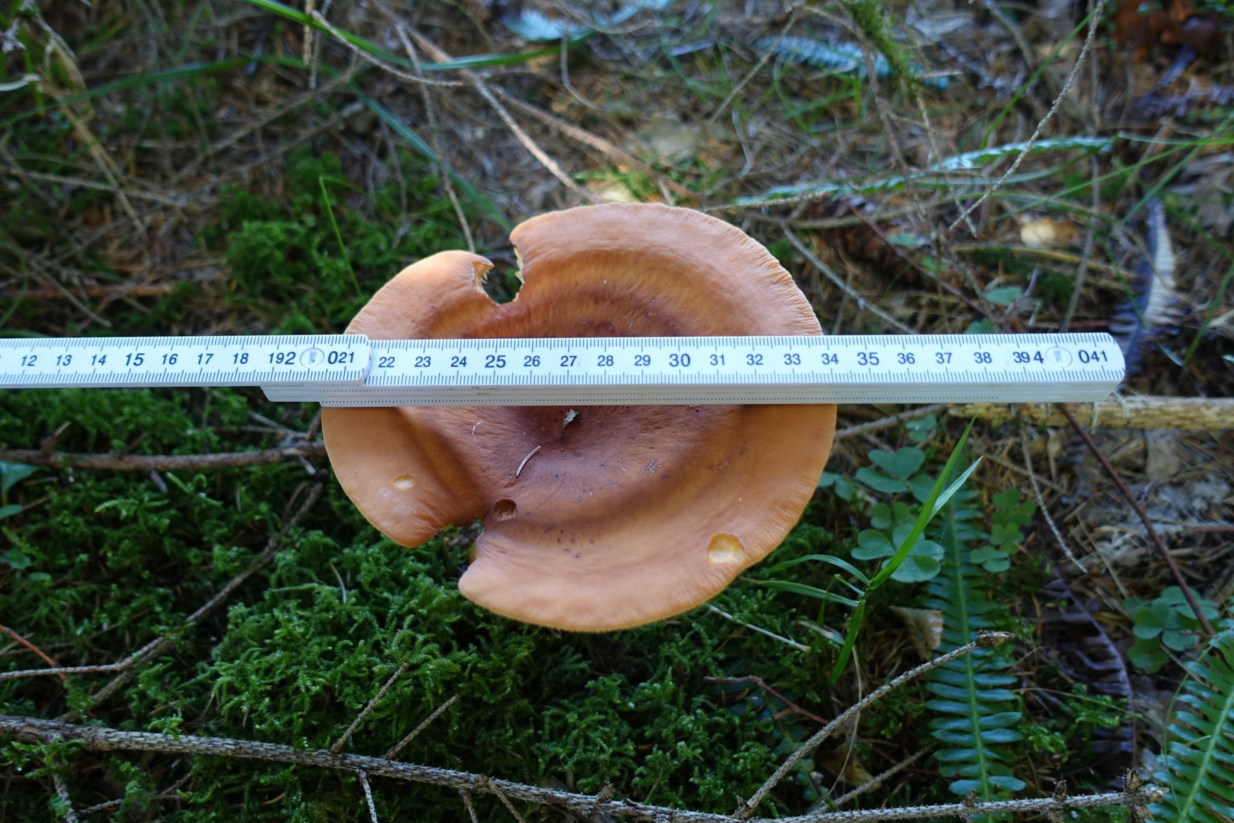 Fruchtkörper allgemein: Gefunden habe ich 3 Fruchtkörper, 2 zeige ich. FK1 (entnommen) kleiner und jünger, FK2 (nicht entnommen) 14 cm Durchmesser. Von FK 3 gibt es kein Bild, er war aber noch größer als FK2.