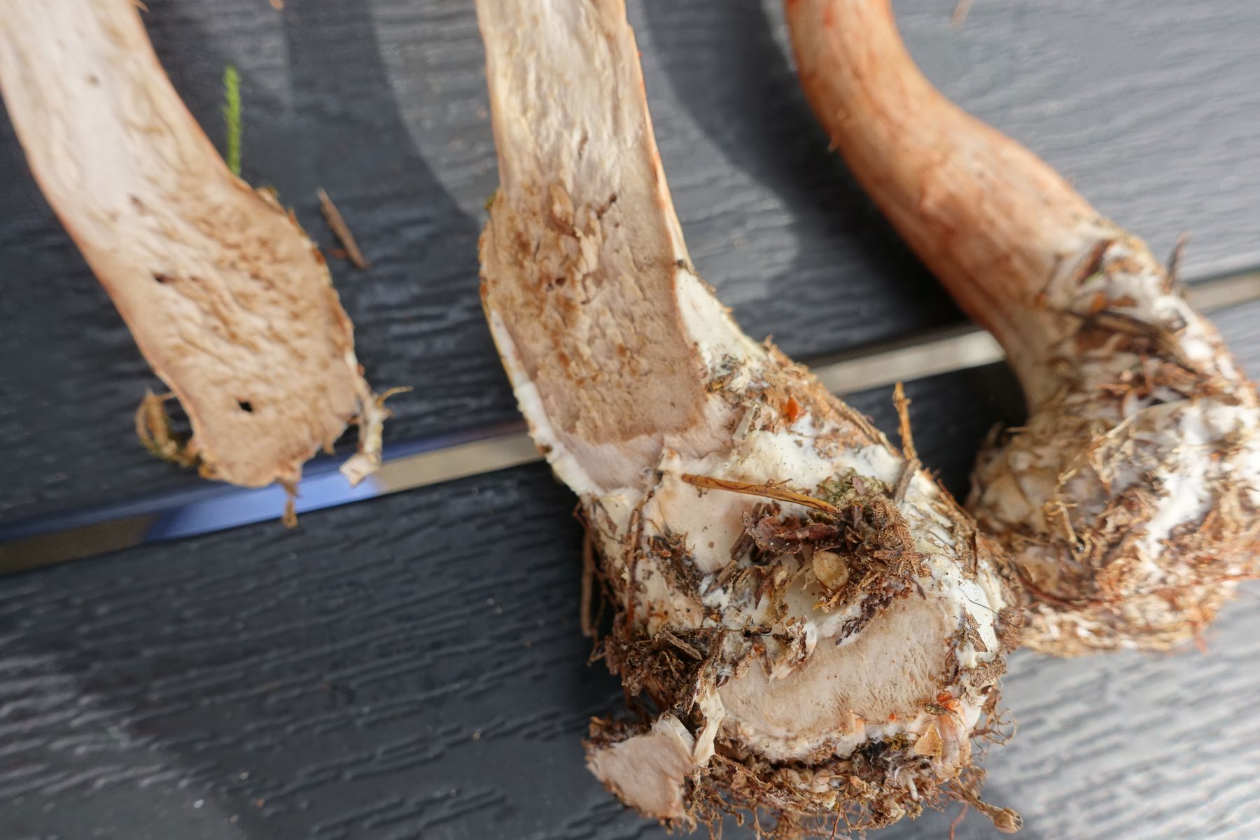 Stiel: zylindrisch, lang / schmal. Ø max 2,5 cm. Länge bis zum Knollenansatz 6-8 cm. Oben beige, nach unten hin immer dunkler bis zu rötlichem Hellbraun. Dann weißlich-beige beim Übergang zur Knolle. Knolle und Stiel gehen vom Wuchs her ineinander über, sind aber farblich abgesetzt. Knolle dunkles Weiß / beige. Oberer Rand vom weißen Bereich mit leichtem Rand versehen.