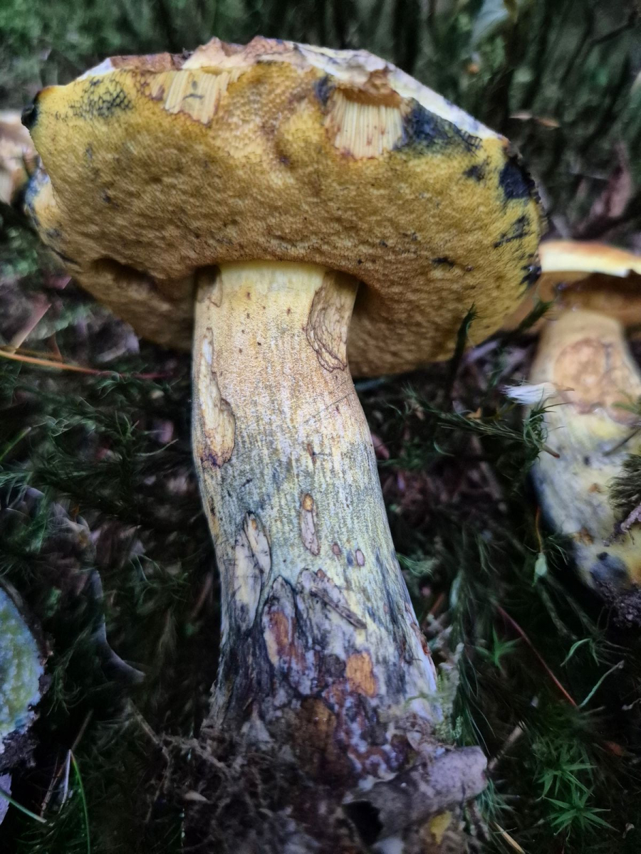 Für Cyanoboletus pulverulentus waren mir die Fruchtkörper zu kräftig. Geruch und Geschmack waren mild. Aufgrund des unverzüglichen, starken Blauens bei Berührung von außen und im Schnitt würde ich auch Butyriboletus als Gattung ausschließen. Die Stieloberfläche erinnert mich schon an einen Flocki. Könnte es sich um Boletus junquilleus/Boletus pseudosulphureus handeln?
