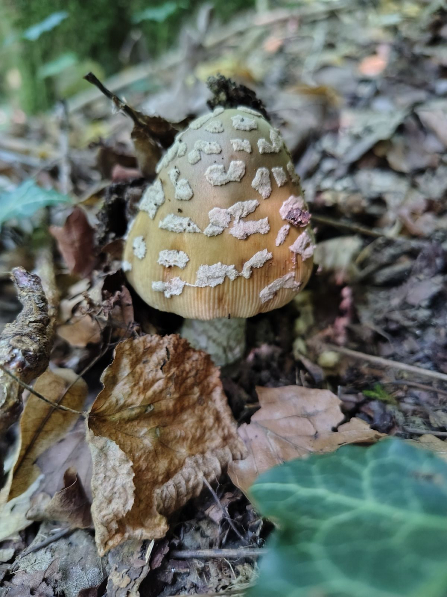ich war heute im Hauswald unterwegs um nach Vertrautem zu schauen. Das war nicht da; allerdings lauter Arten die ich dort mit Sicherheit noch nie gesehen habe. Sehr auffällig war dieser Scheidenstreifling. Er wuchs auf einer südlich ausgerichteten Kalkkuppe direkt bei Linde, aber auch mit Buche, Eiche und Haselnuss in der Nähe. Die Velumflocken auf dem Hut waren auffallend hell. Amanita ceciliae wuchs auch nicht weit entfernt und die kenne ich eher mit grauen Velumflocken auf dem Hut. An der Stielbasis war so gut wie keine Scheide sichtbar.