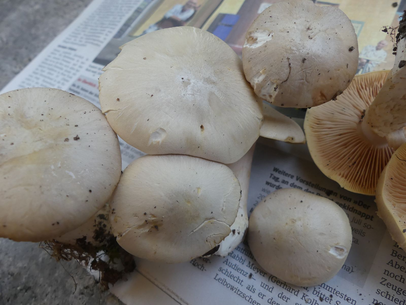 Einmal mehrere Exemplare vom Riesenrötling Entoloma sinuatum im thermophilen Eichen-Hainbuchen-Mischwald auf kalkhaltigem Boden in der Nähe von Würzburg unter einer Eiche. Dann - auf dem Rückweg/Heimfahrt - in der Nähe von der BAB Tankstelle Rohrbrunn an der A3 in schon fast Mittelgebirgslage vier Exemplare vom Hasenröhrling Gyroporus castaneus. Hier sind mir die Bodenverhältnisse unbekannt. Der wuchs auf einem aufgegebenen Rückeweg in Steilhanglage und war gut vor jeglichem Sonnenlicht abgeschirmt.
