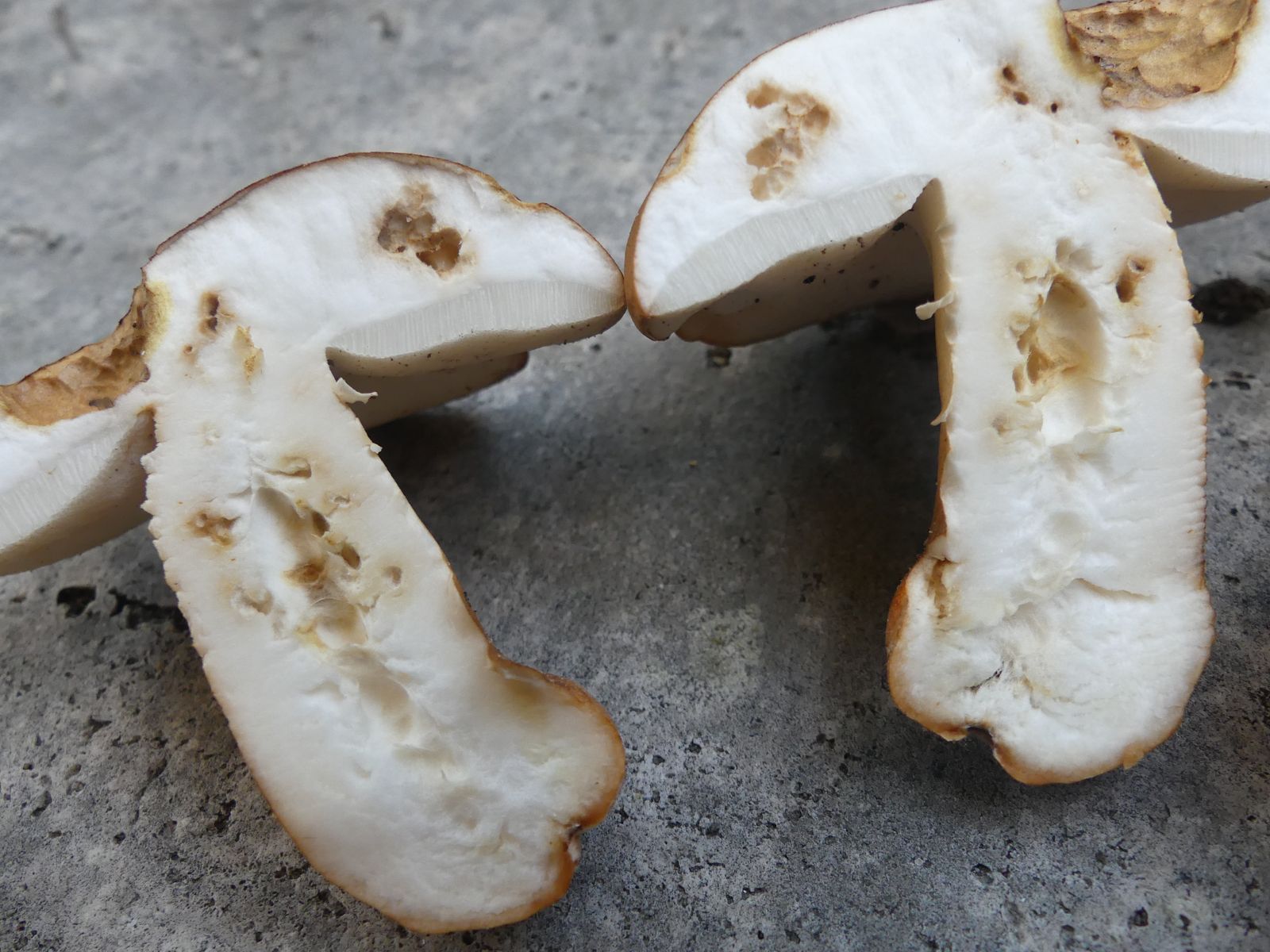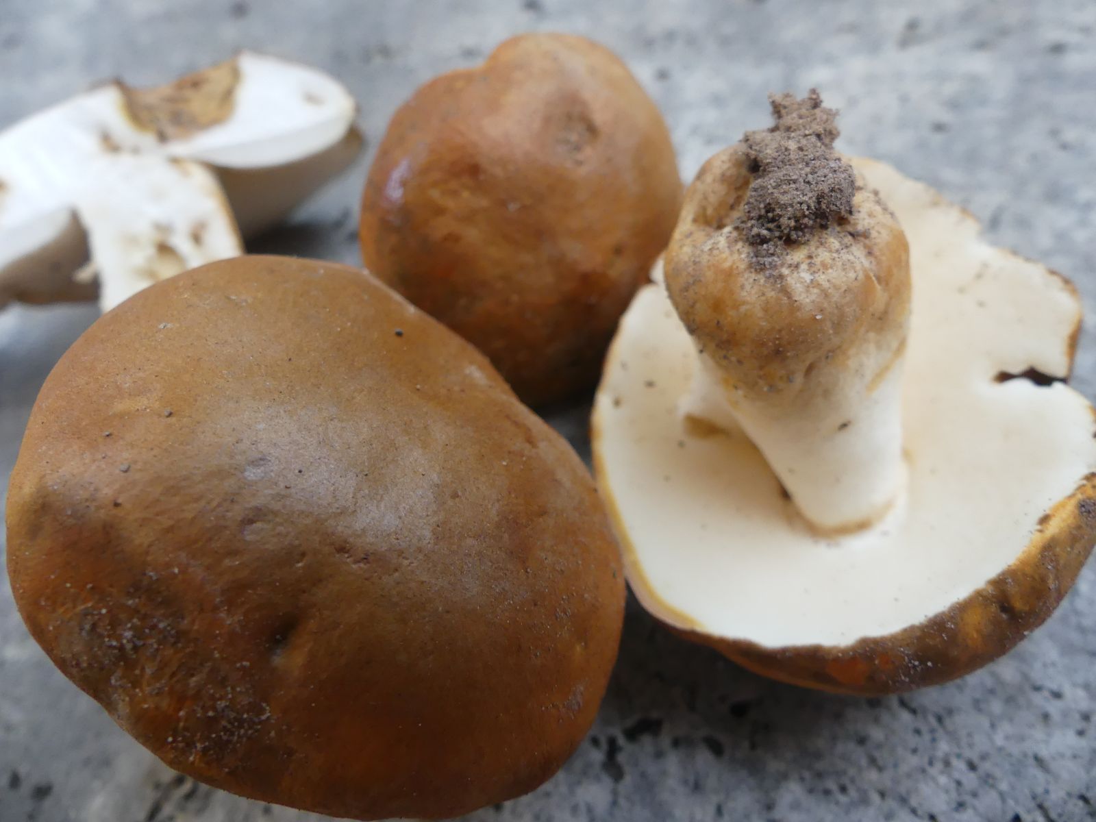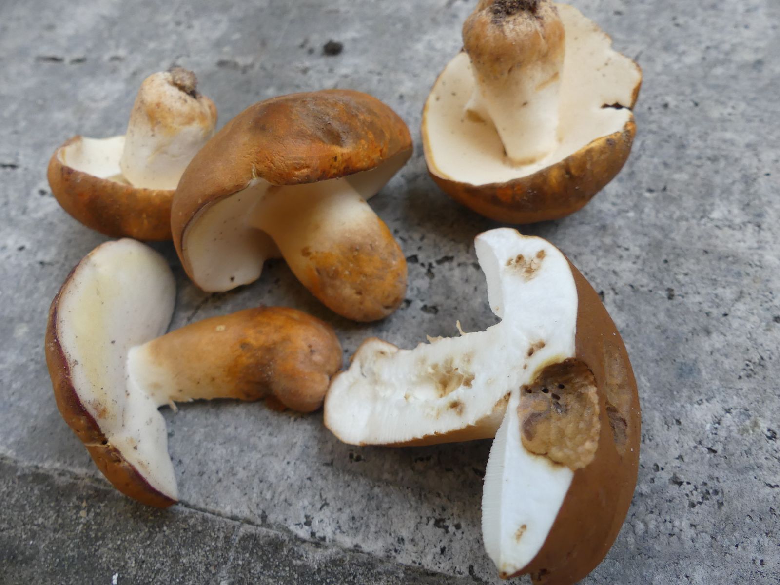 Einmal mehrere Exemplare vom Riesenrötling Entoloma sinuatum im thermophilen Eichen-Hainbuchen-Mischwald auf kalkhaltigem Boden in der Nähe von Würzburg unter einer Eiche. Dann - auf dem Rückweg/Heimfahrt - in der Nähe von der BAB Tankstelle Rohrbrunn an der A3 in schon fast Mittelgebirgslage vier Exemplare vom Hasenröhrling Gyroporus castaneus. Hier sind mir die Bodenverhältnisse unbekannt. Der wuchs auf einem aufgegebenen Rückeweg in Steilhanglage und war gut vor jeglichem Sonnenlicht abgeschirmt.