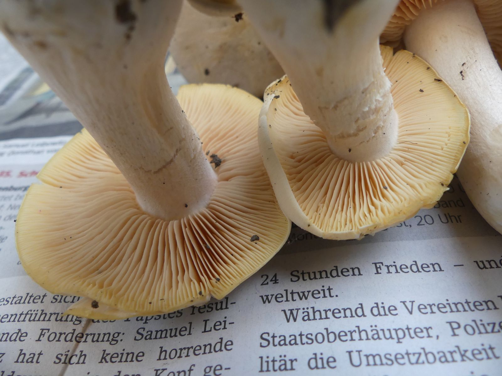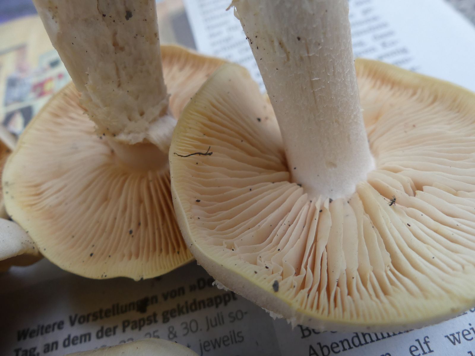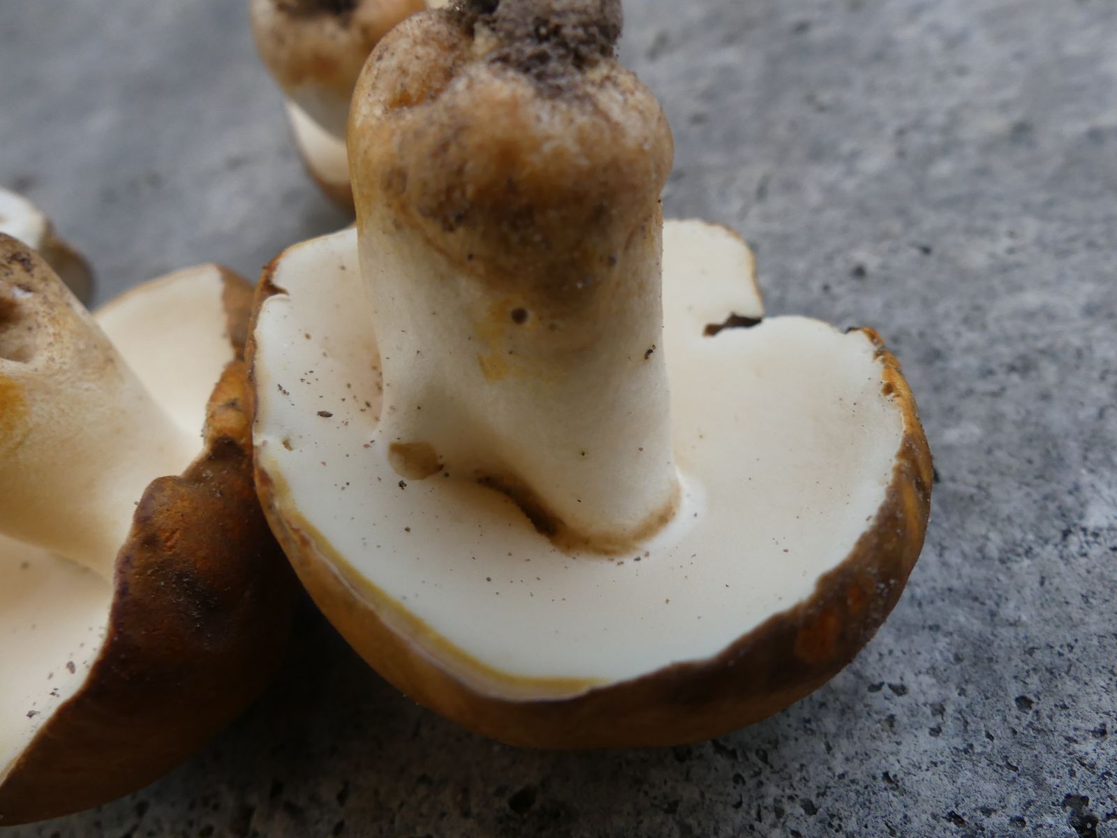 Einmal mehrere Exemplare vom Riesenrötling Entoloma sinuatum im thermophilen Eichen-Hainbuchen-Mischwald auf kalkhaltigem Boden in der Nähe von Würzburg unter einer Eiche. Dann - auf dem Rückweg/Heimfahrt - in der Nähe von der BAB Tankstelle Rohrbrunn an der A3 in schon fast Mittelgebirgslage vier Exemplare vom Hasenröhrling Gyroporus castaneus. Hier sind mir die Bodenverhältnisse unbekannt. Der wuchs auf einem aufgegebenen Rückeweg in Steilhanglage und war gut vor jeglichem Sonnenlicht abgeschirmt.