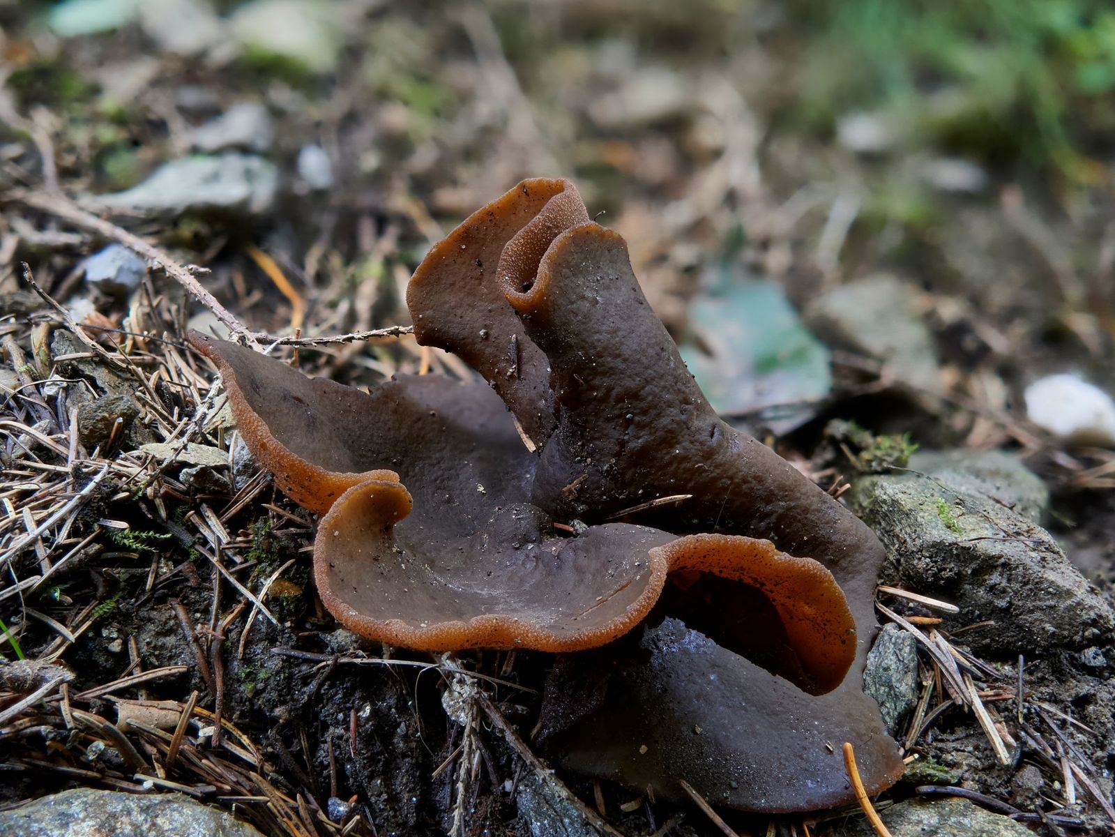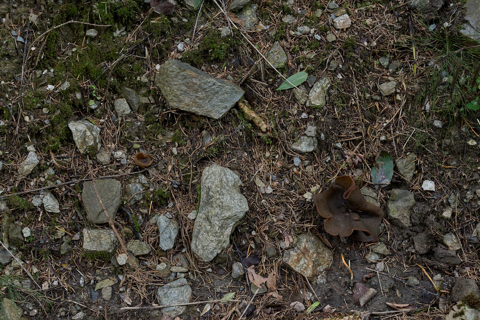 Fund vom 06.08.2025 in einem Waldstraßengraben. Kleine Aststücke waren dort mit mineralischem Substrat vermischt. Ich habe die FK unberührt vor Ort gelassen; in die Feinheiten der Pilzbestimmung arbeite ich mich nicht ein, da ich jede freie Minute draußen verbringe. Das große Exemplar maß ca. 11 cm im DM.