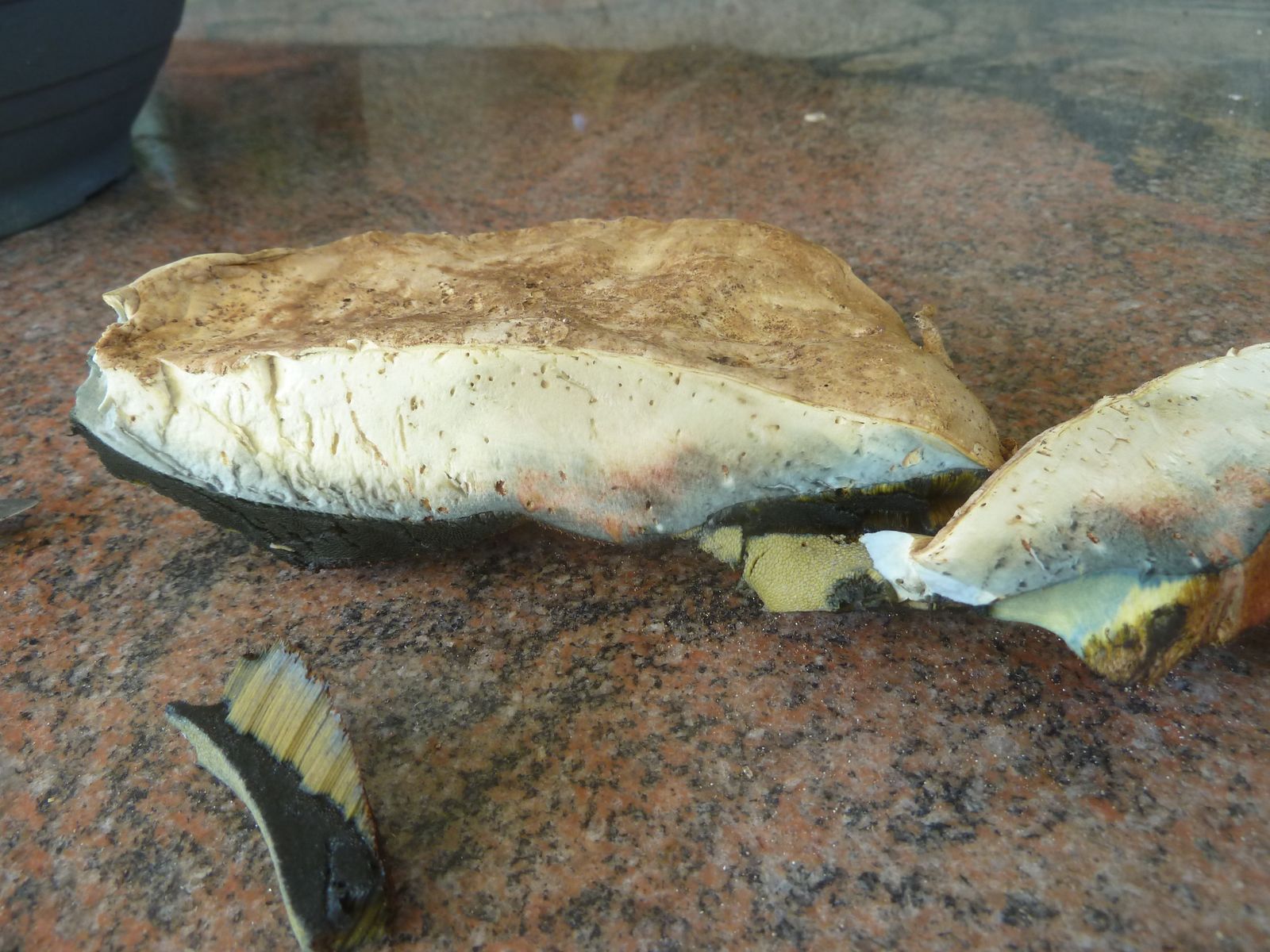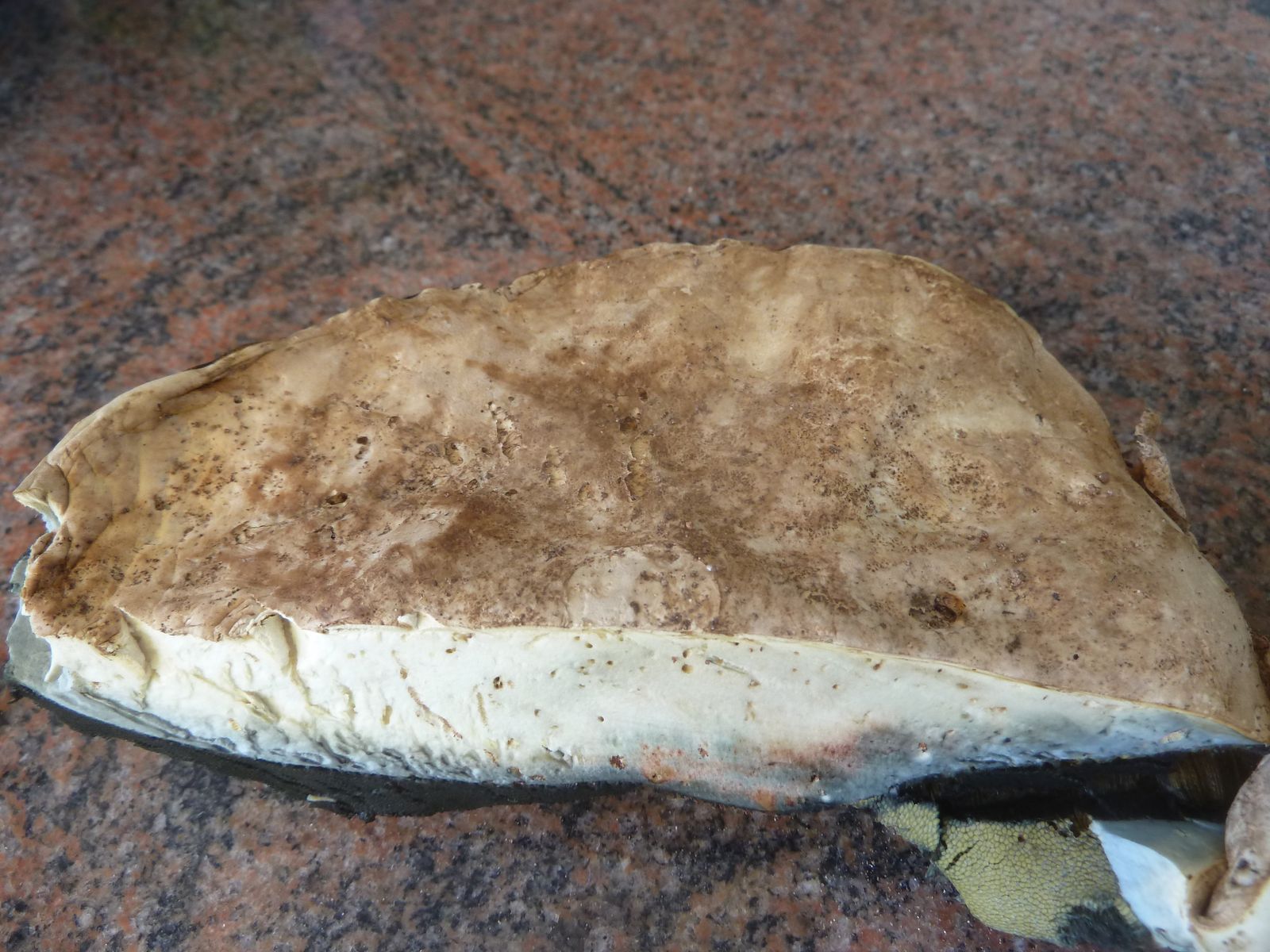 Nach der Entnahme ist mir die für einen WuBi in diesem Reifegrad etwas helle und nicht rissige Hutoberfläche aufgefallen. Die nächste Unregelmäßigkeit war das Verfärbungsmuster des Hutes, nur direkt oberhalb vom Röhrenboden blauend, aber nicht im restlichen Hutfleisch.