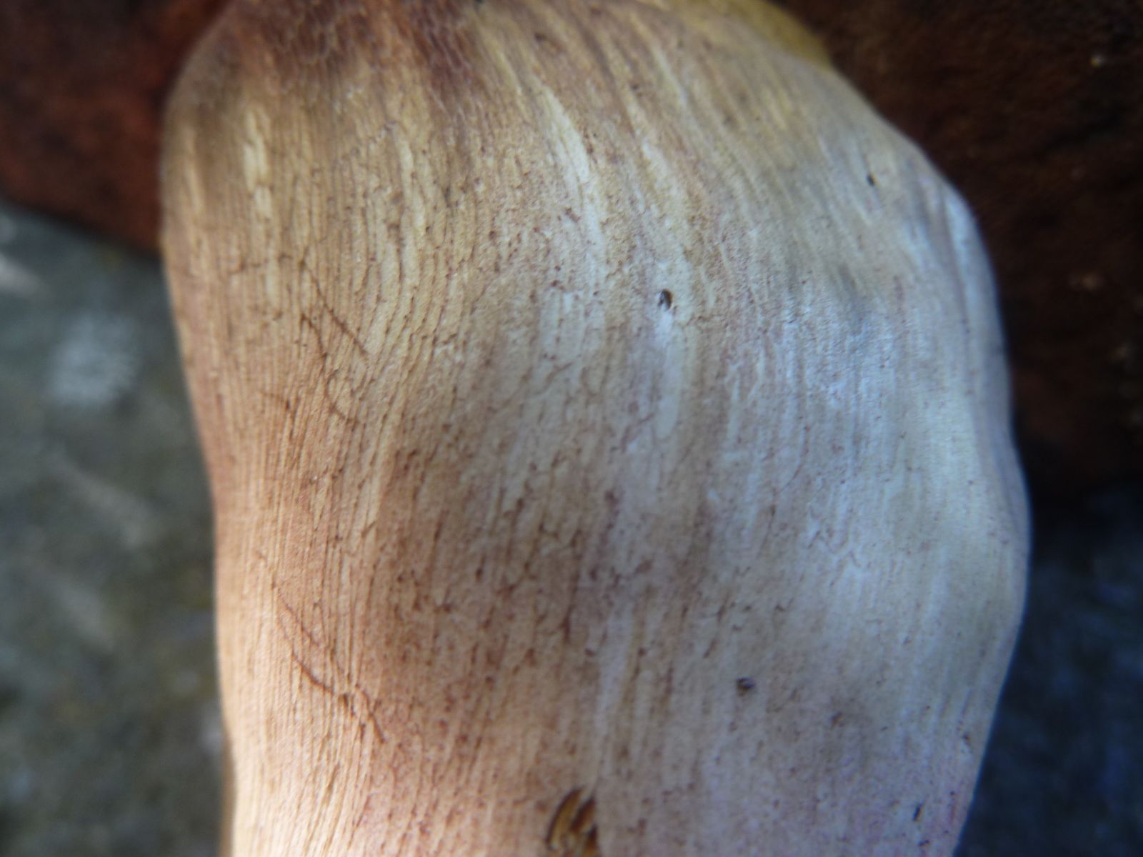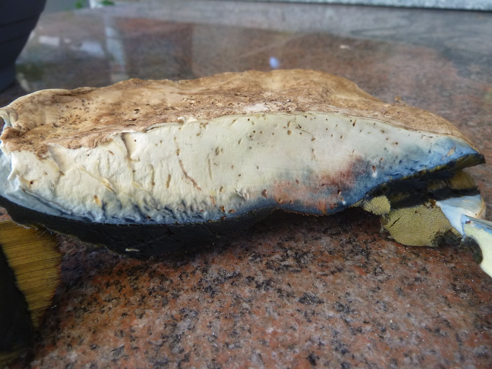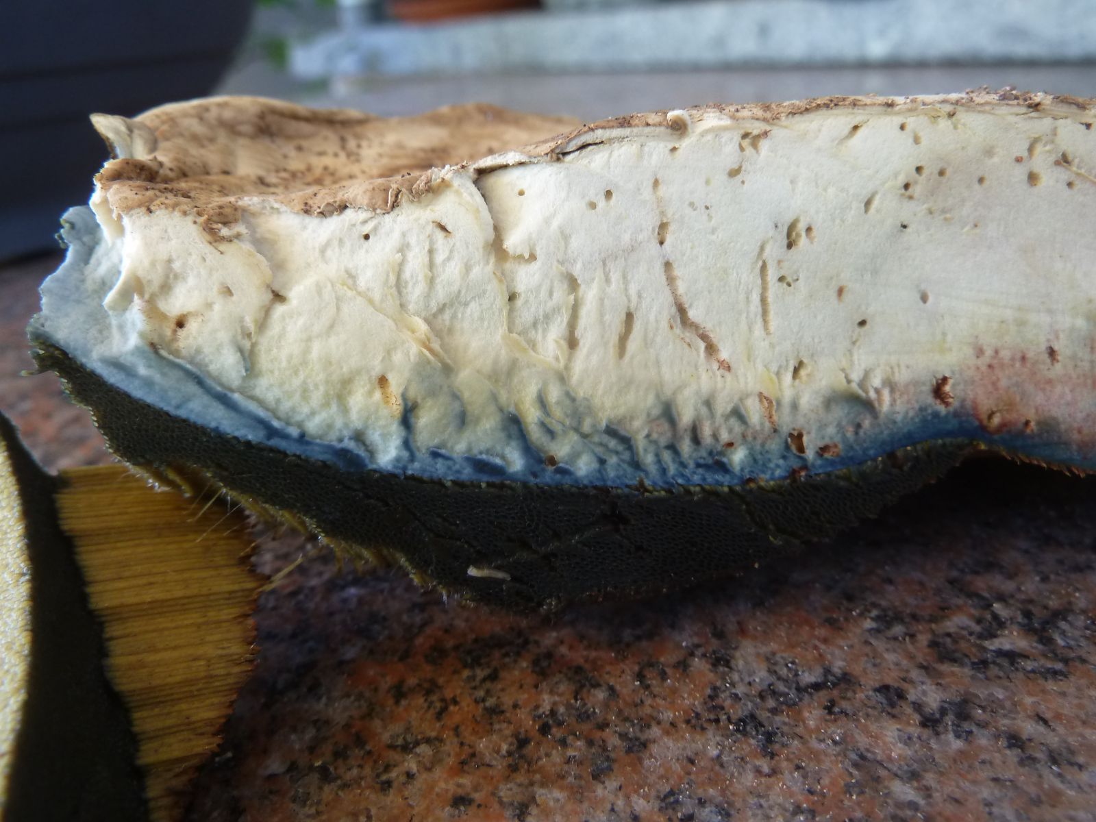 Nach der Entnahme ist mir die für einen WuBi in diesem Reifegrad etwas helle und nicht rissige Hutoberfläche aufgefallen. Die nächste Unregelmäßigkeit war das Verfärbungsmuster des Hutes, nur direkt oberhalb vom Röhrenboden blauend, aber nicht im restlichen Hutfleisch.