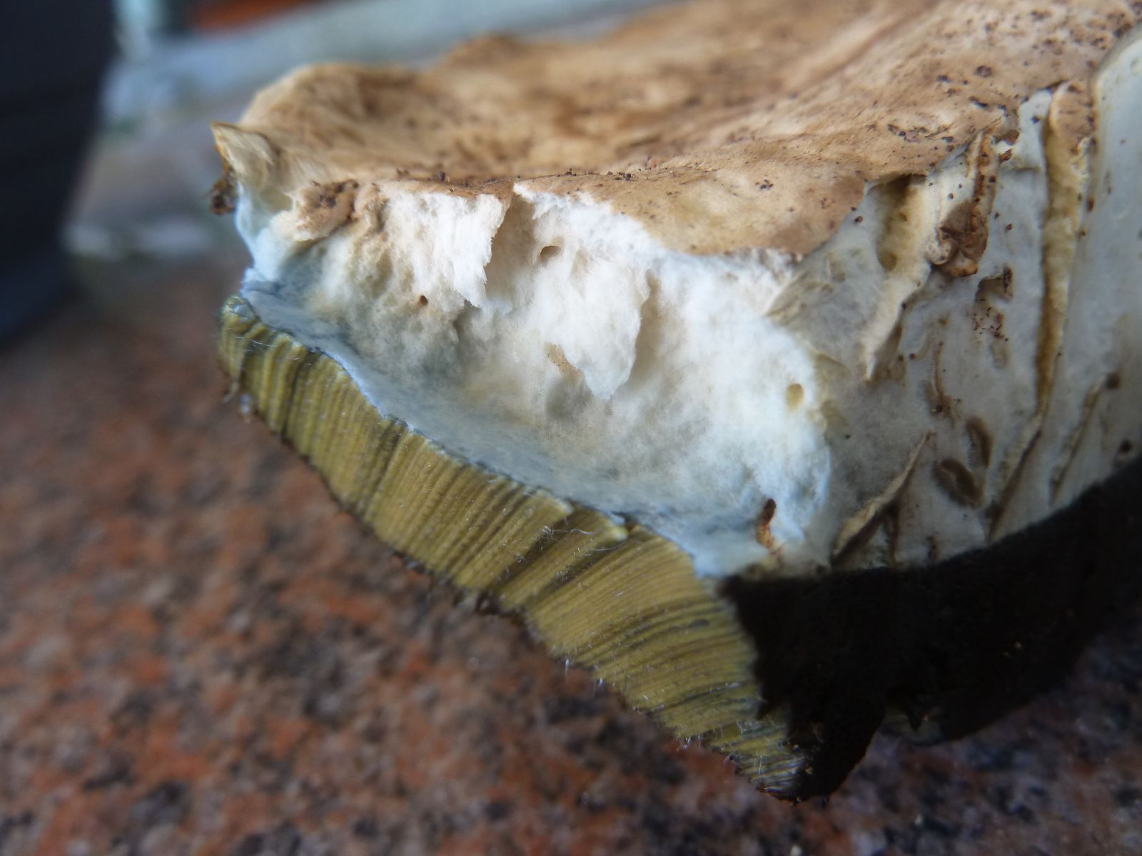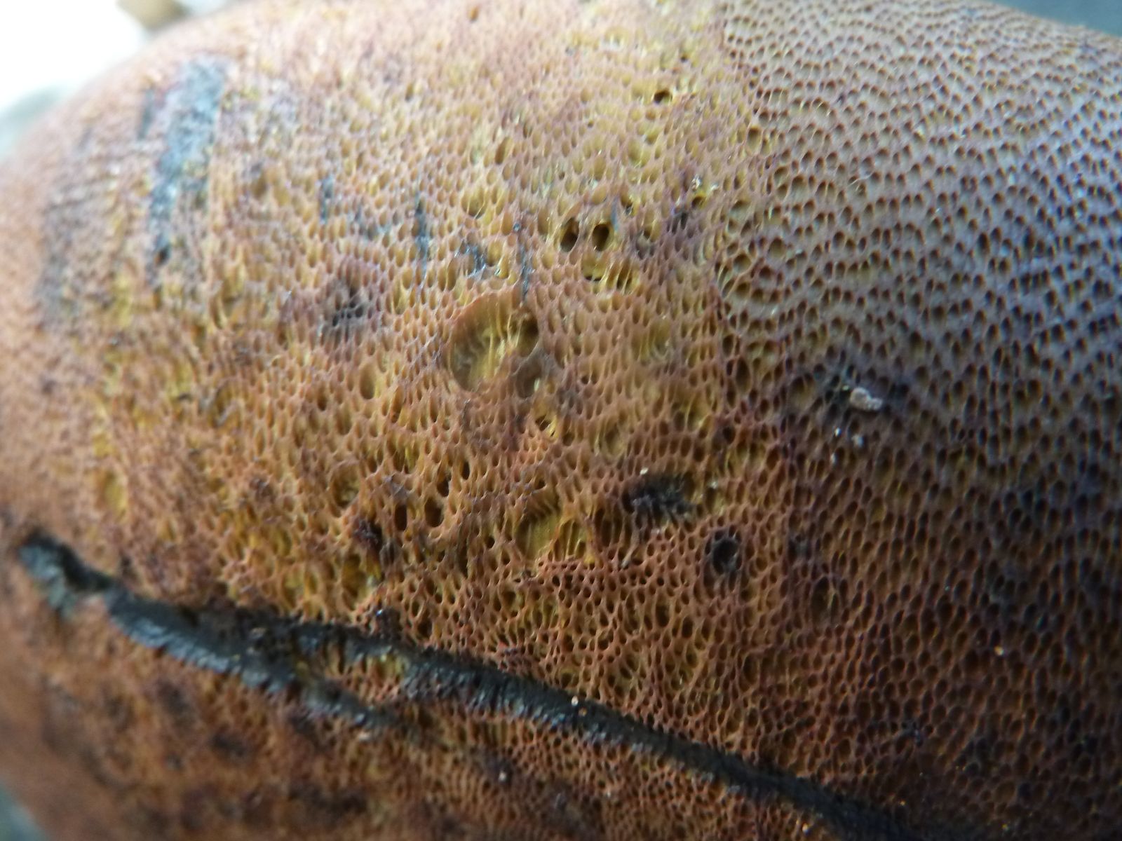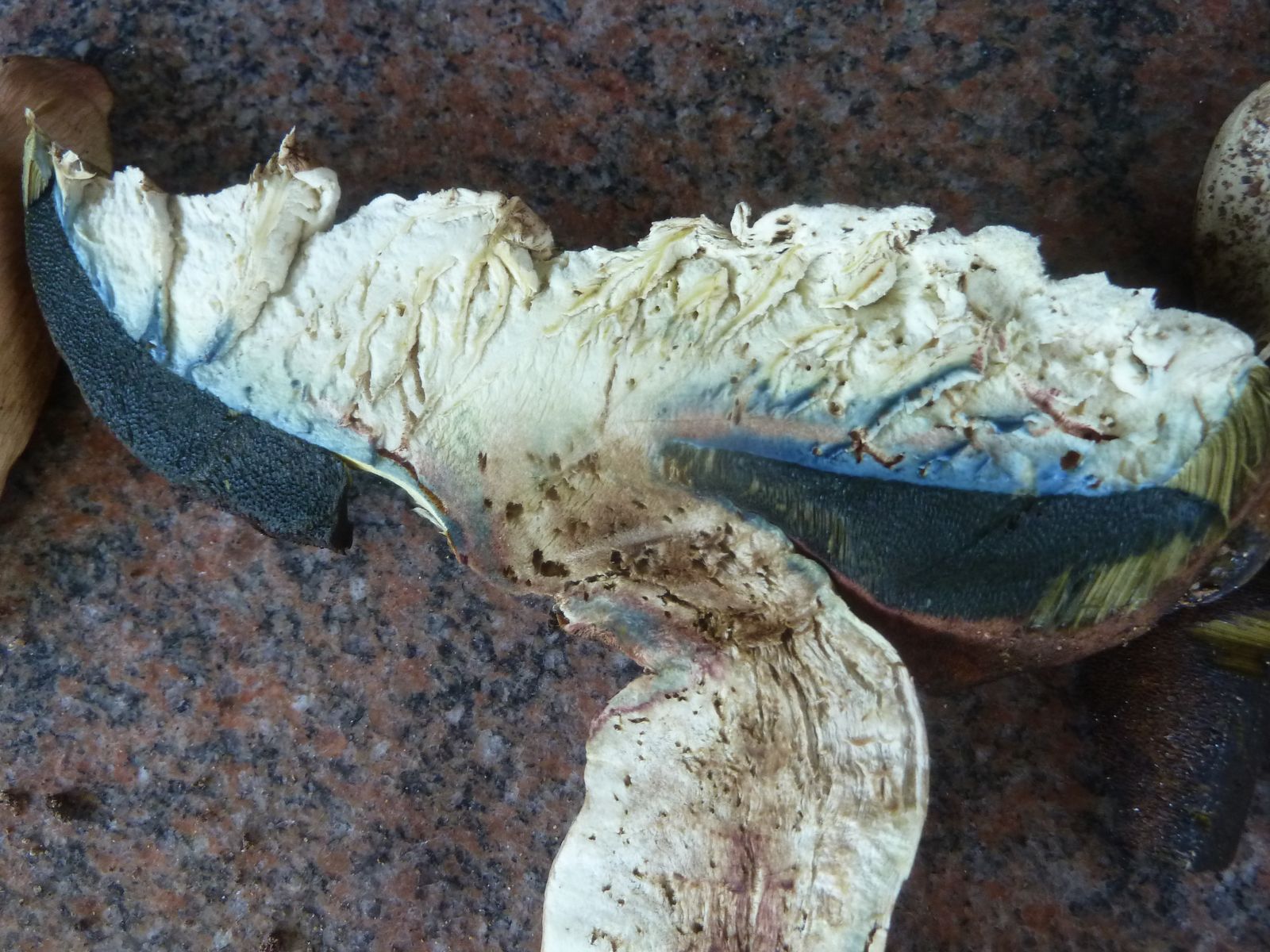 Nach der Entnahme ist mir die für einen WuBi in diesem Reifegrad etwas helle und nicht rissige Hutoberfläche aufgefallen. Die nächste Unregelmäßigkeit war das Verfärbungsmuster des Hutes, nur direkt oberhalb vom Röhrenboden blauend, aber nicht im restlichen Hutfleisch.