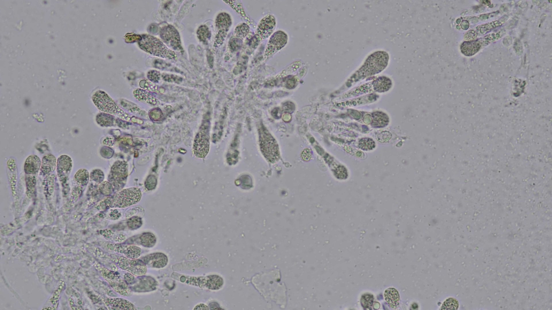 - Sporen mit etwas Wasser auf den Objektträger, Deckglas drauf, quetschen.
