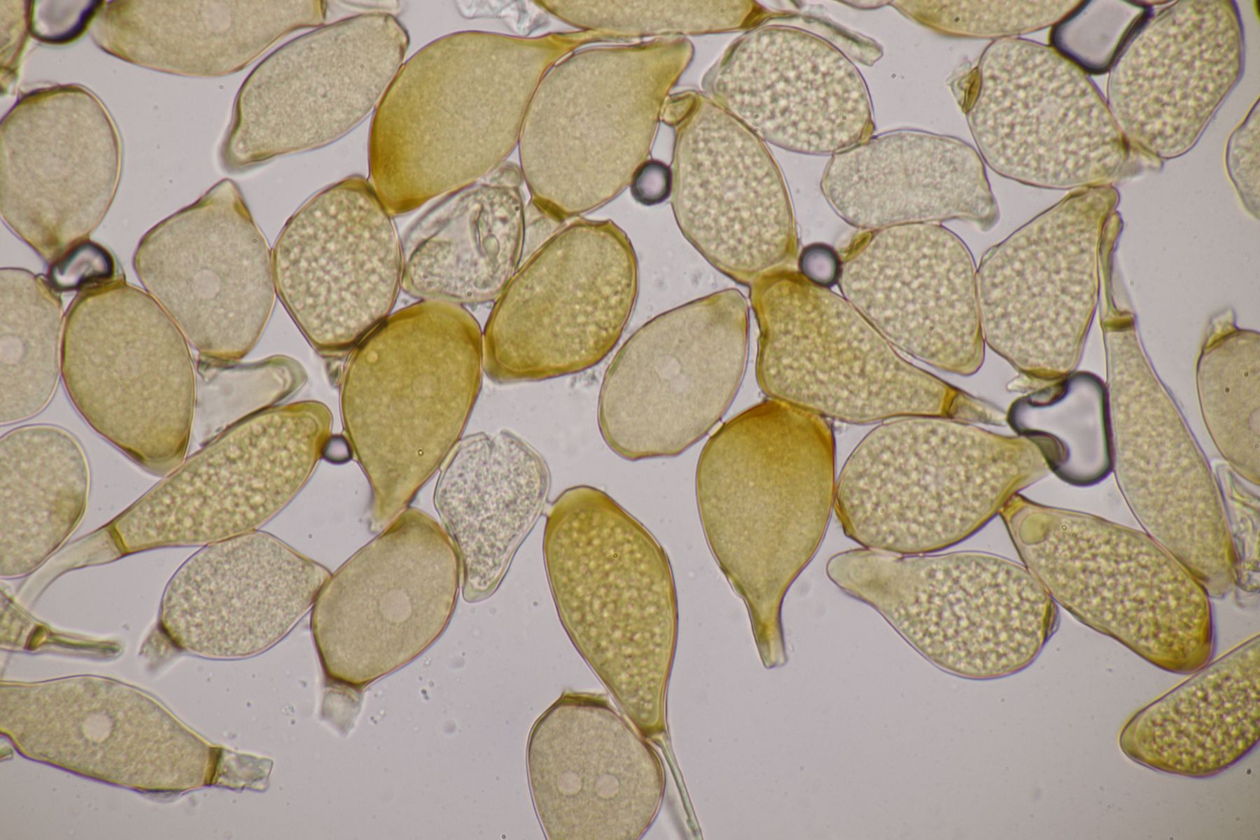 die vierzelligen Teliosporen stammen aus den schwarzen Lagern, die runden, gelblichen Uredosporen mit den hübschen Stacheln stammen aus den orange-gelben Uredien, die ebenfalls auf der Blattunterseite zu sehen sind.