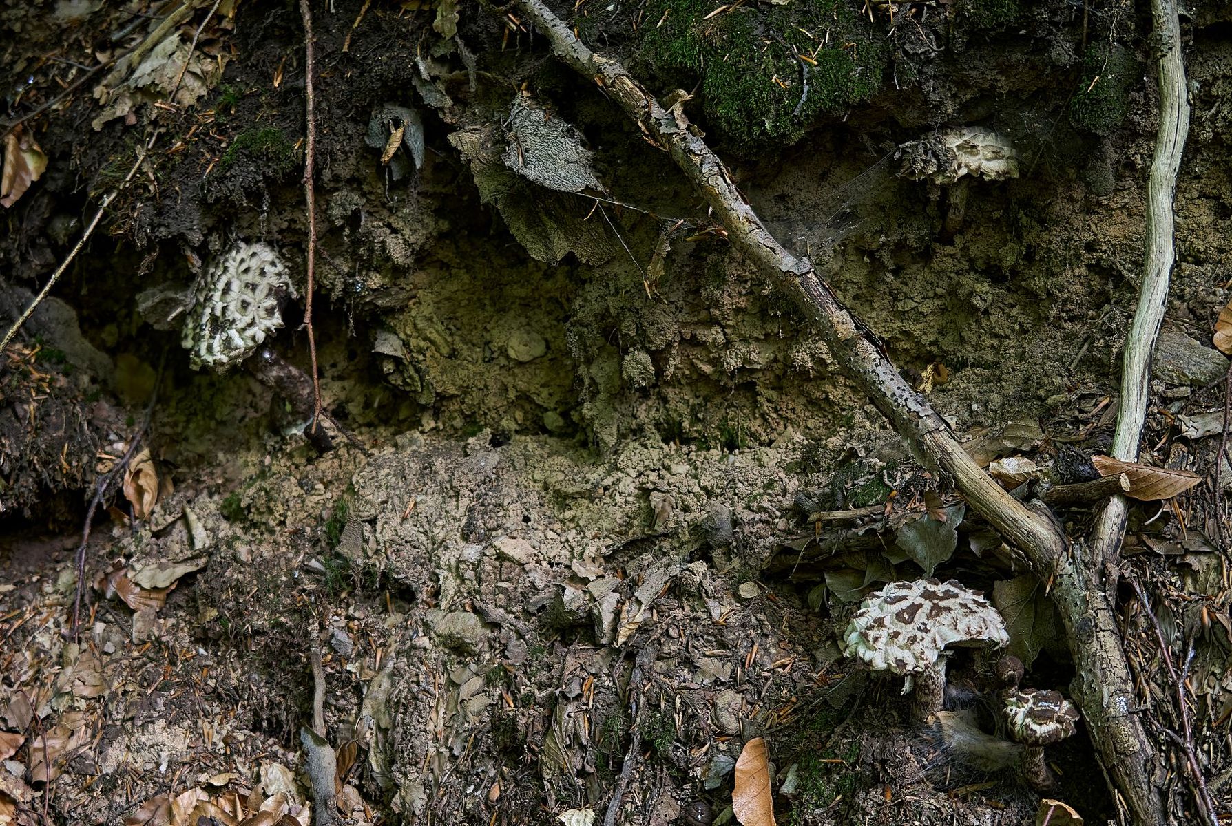 Wegen der Trockenheit hatte ich kaum Hoffnung, nebenbei auf fotogene Pilzmotive zu treffen, aber es kam anders. Gleich nach dem Einstieg in einen Hohlweg leuchteten mir Strubbelkopfröhrlinge entgegen. Auf dem Rückweg vom Stolleneingang traf ich dann noch auf 3 Gallenröhrlinge. Letztere hatte ich schon mehr als 10 Jahre nicht mehr zu Gesicht bekommen.