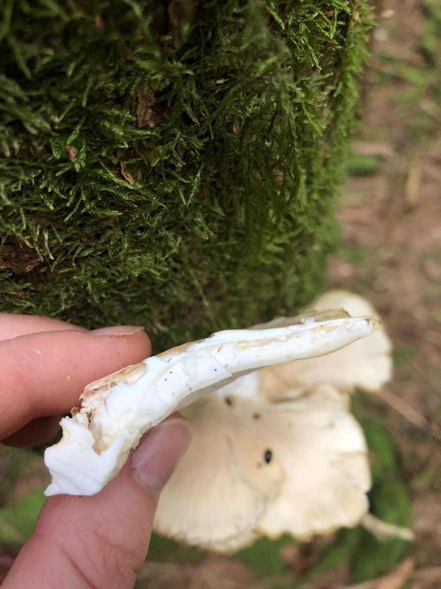 Die Fruchtkörper waren weiß, ungestielt, aber zwei drei größere hatten diesen minimalen Ansatz, der wie ein Stiel wirkte, alle anderen nicht.
