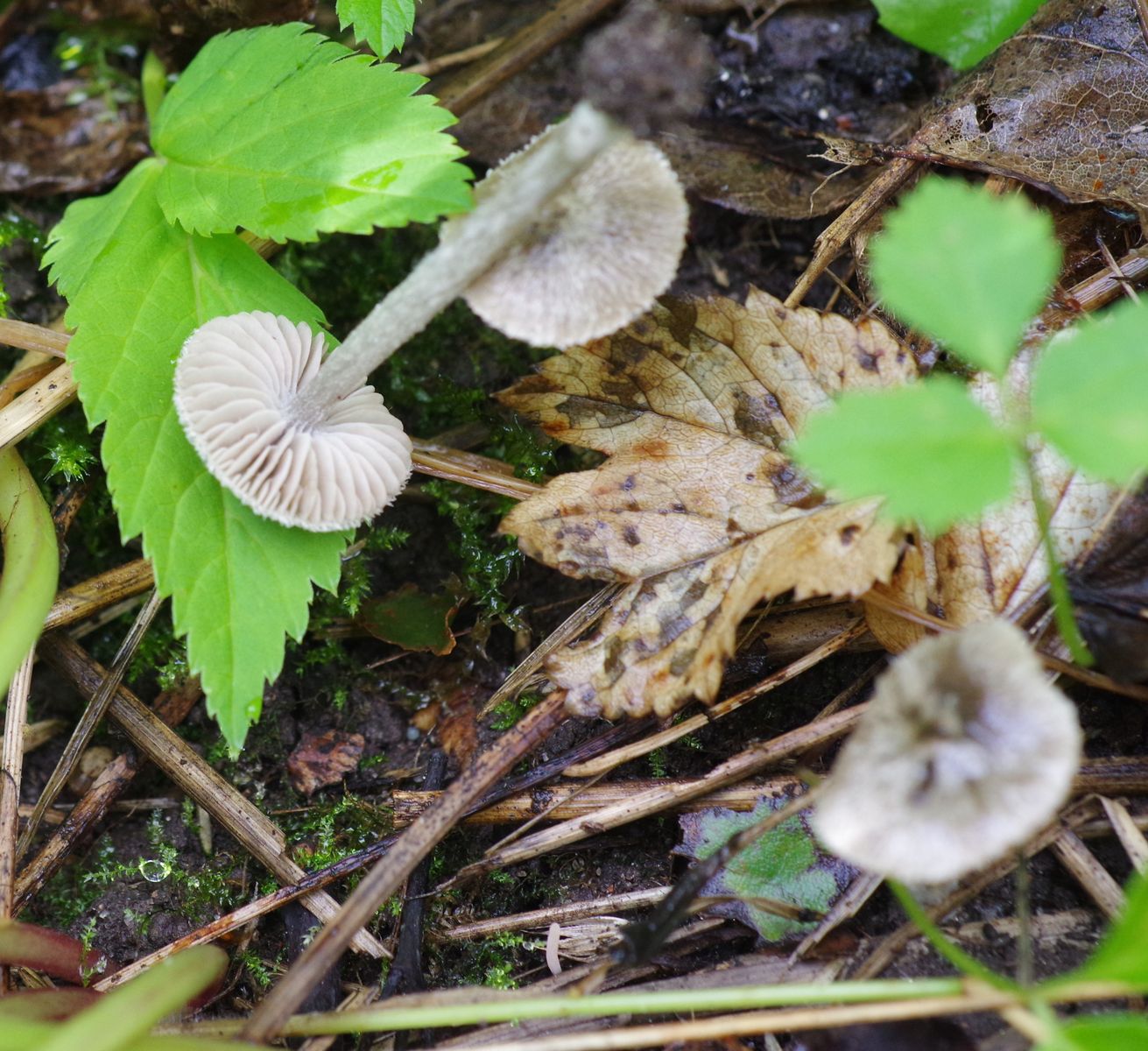 an einer fetten Stelle am Rande der Wiese (unter Laubbäumen, mit Giersch, Beifuß und anderem üppigen Kraut) steht einiges an Pilzen, darunter ein kleiner silbrig glänzender Pilz, den ich wegen Verdacht auf Entoloma mal eingesteckt habe. Den gab es sogar als Kollektion. Hut ca. 15-20 mm im Durchmesser, Stiel ca. 40*2,5 mm, hohl. Lamellen bauchig, buchtig angeheftet, mit vielen Zwischenlamellen und Anastomosen.