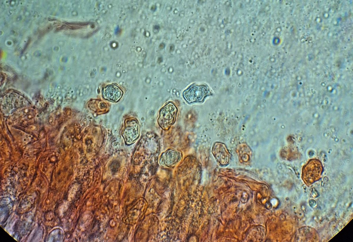 HDS in KR (die Sporen gehören zu den anderen Pilzen, die ich die 150 m bis zum Mikroskop in der Hand hatte - erstaunlich, wie viele davon auf den Hut gekommen sind)