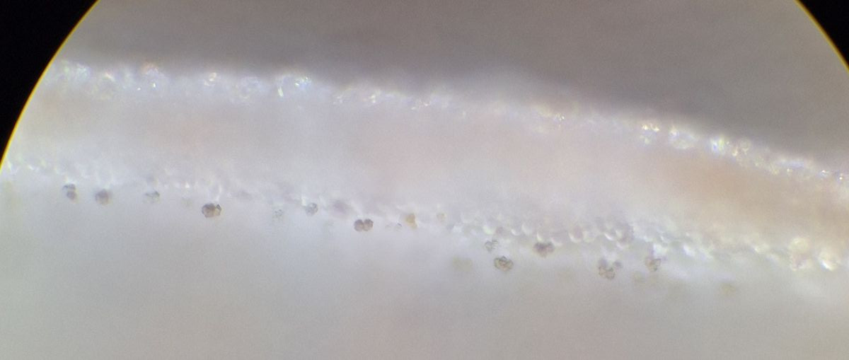 In der Tat habe ich Cheilozystiden gefunden, allerdings nur im stielnahen inneren Drittel/Viertel der Lamelle. Gereicht hat dafür das Durchlicht einer Lamelle mit dem 10er: