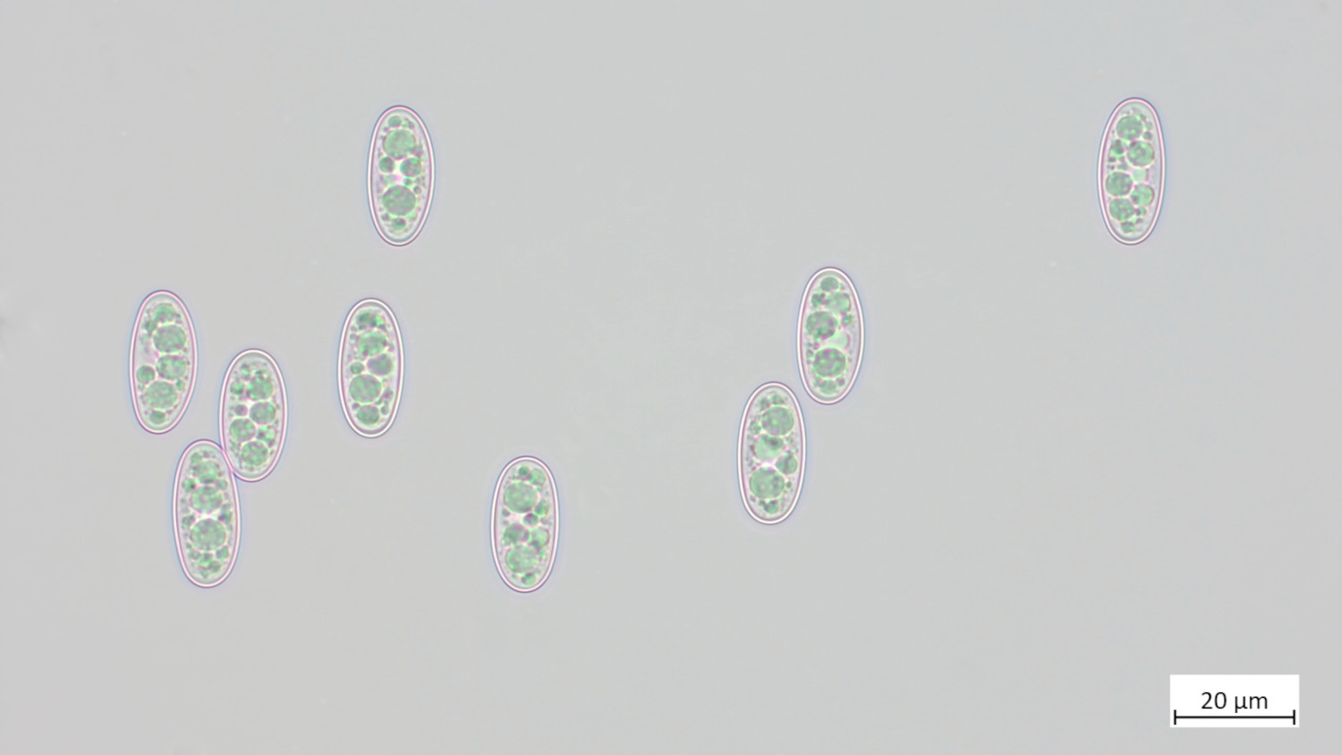 Sporen (49 gemessen): 23.4 µm (21.3–25.2 µm) × 11.8 µm (10.8–12.7 µm), Q = 1.99 (1.78–2.22)