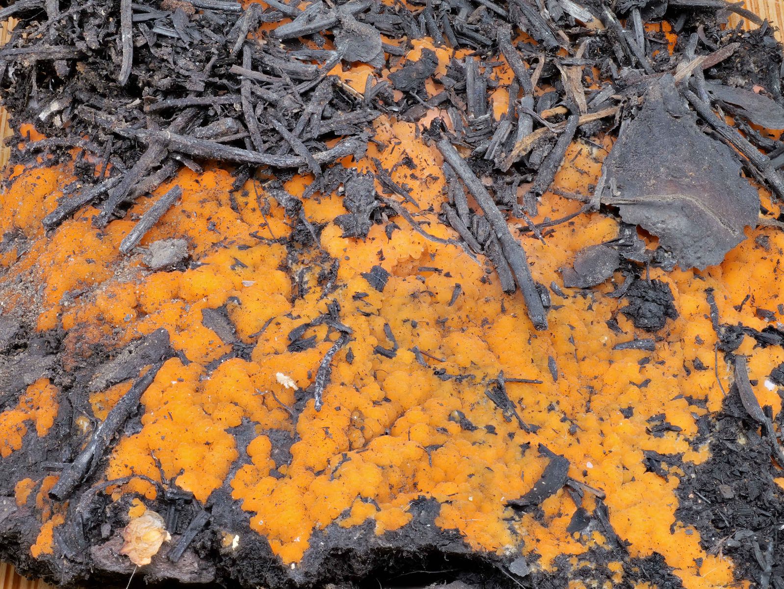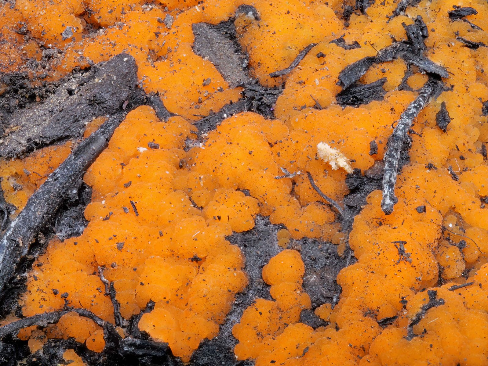 Doch schon gleich am Waldrand entdeckte ich, wonach ich gesucht hatte: die leuchtend orangeroten Polster von Pyronema. Überall auf den Brandstellen waren sie zu finden. Die meisten bereits adult, nur wenige im Anfangsstadium.
