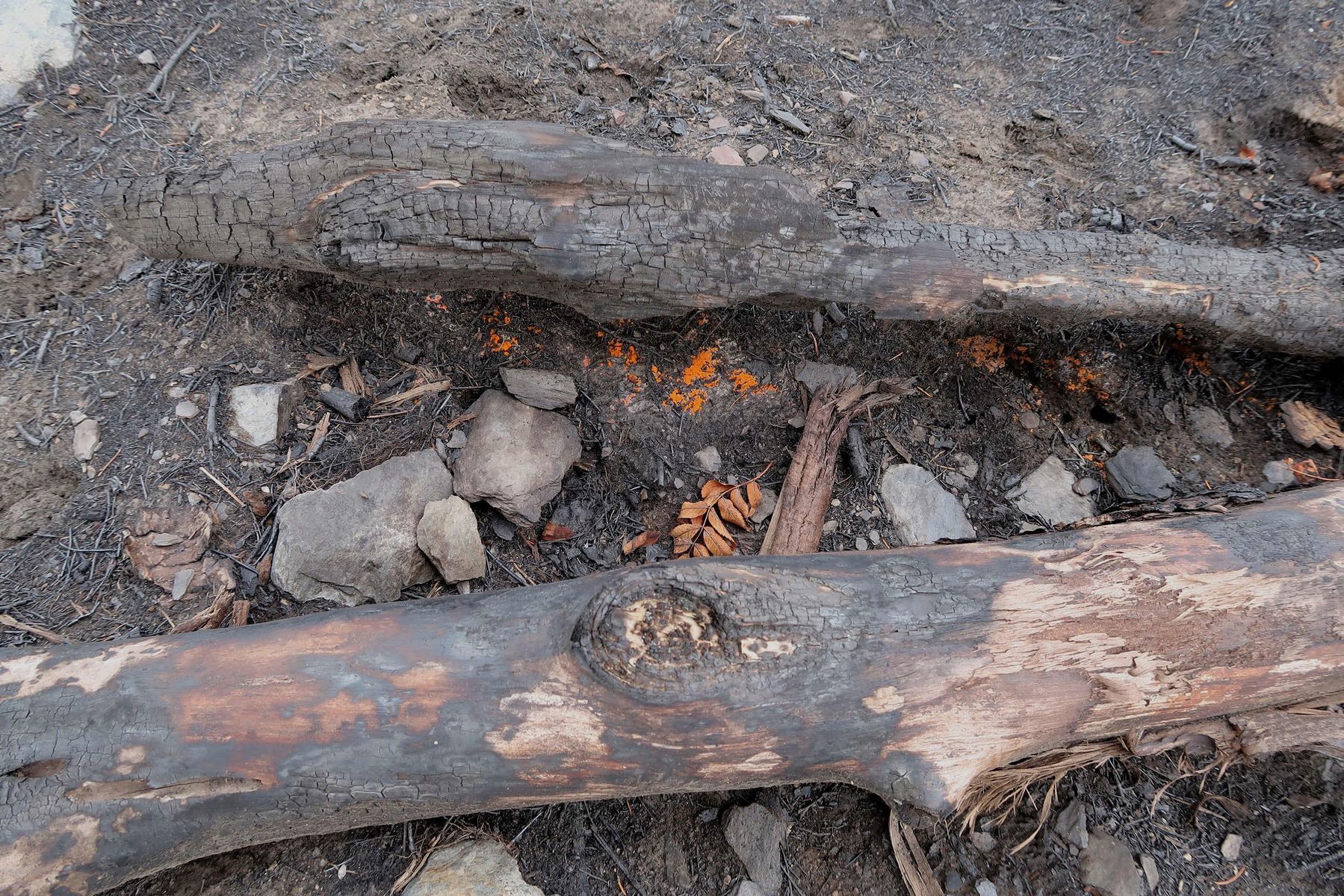 Am Waldrand angekommen, zeigte sich der Boden in verschiedenen Rottönen verbrannt – ein deutliches Zeichen für die enorme Hitze.