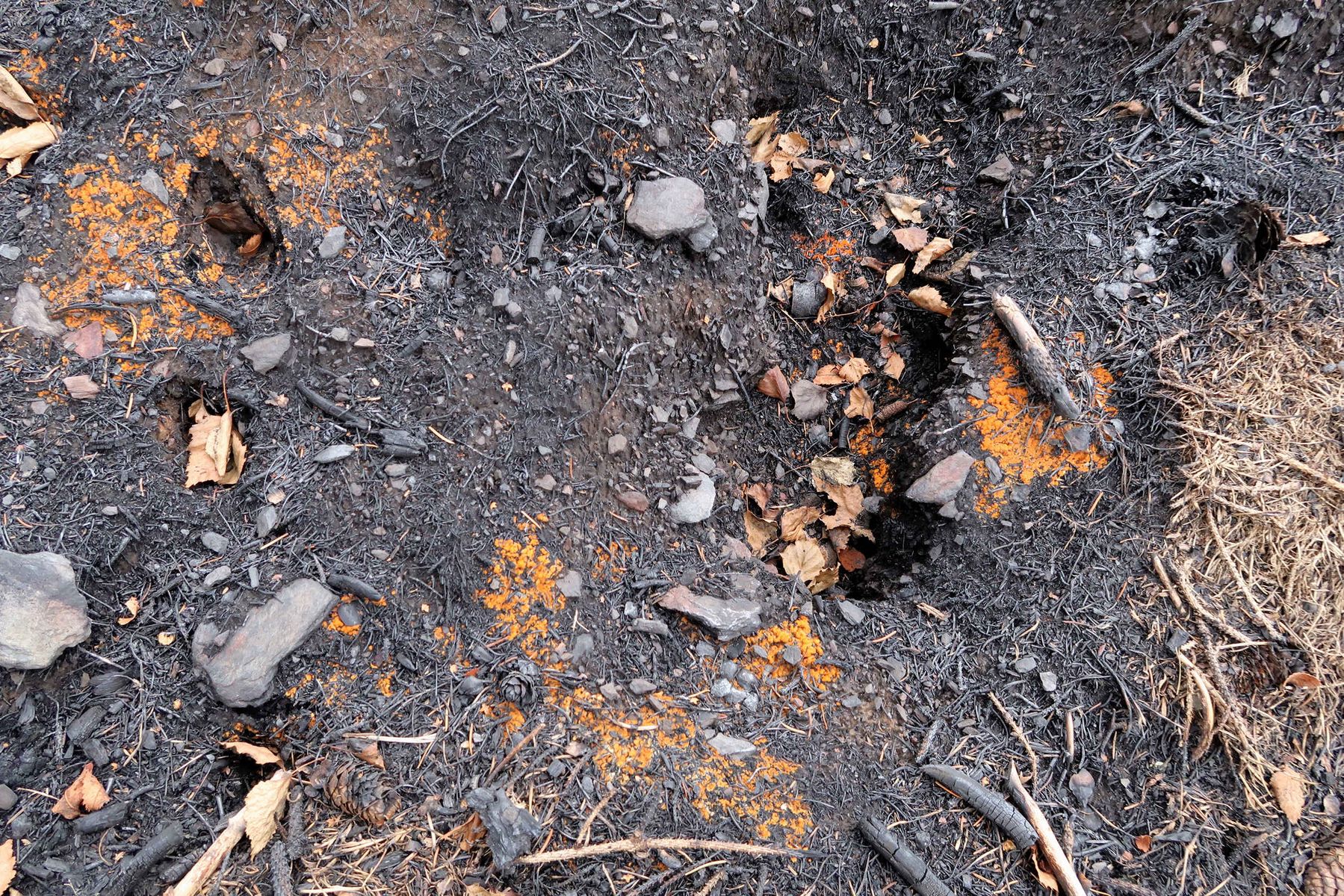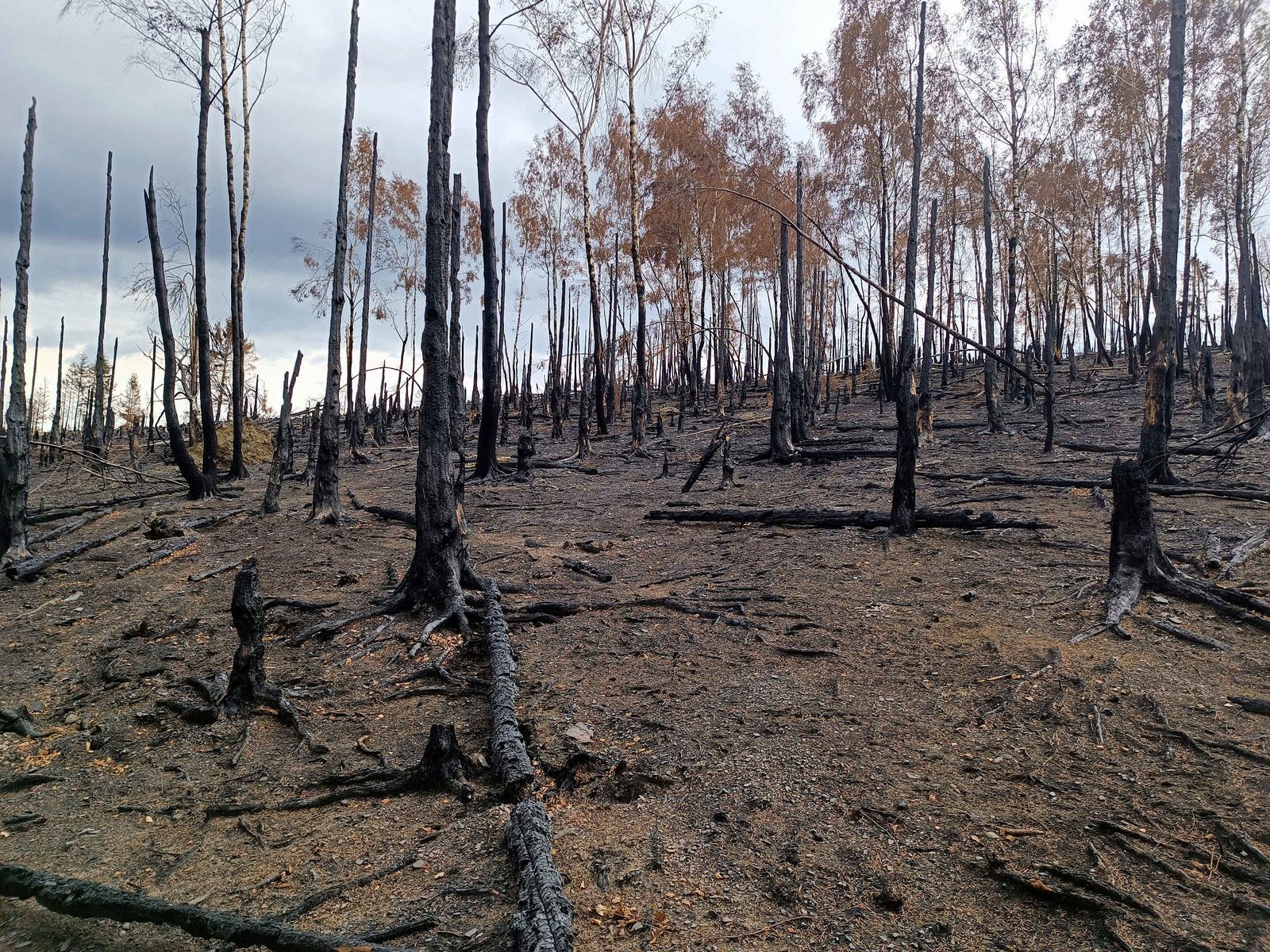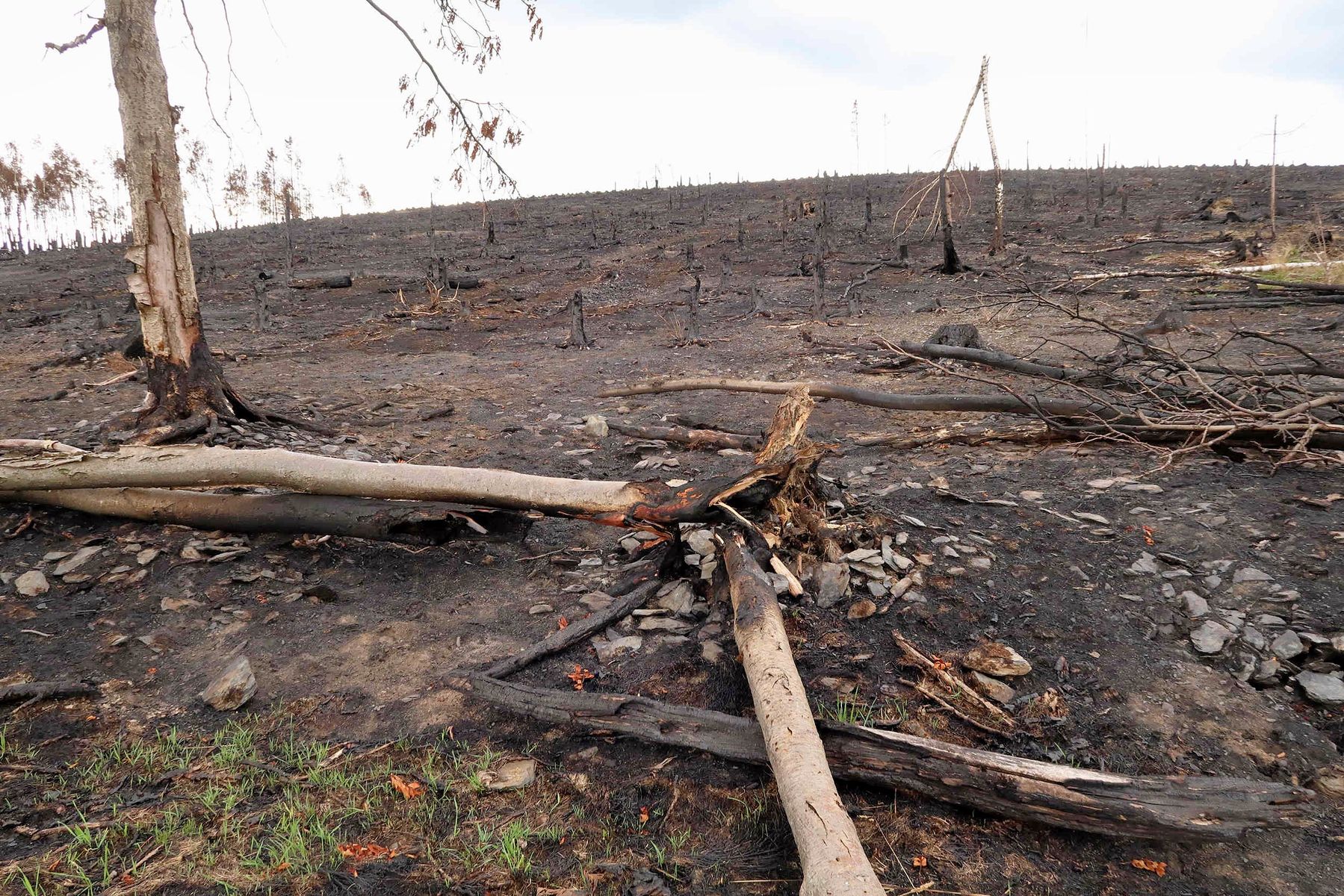 Teilweise waren noch Spuren der Löschwasserstrahlen zu sehen, einige Baumstümpfe und Senken waren noch feucht. Insgesamt war das Gebiet aber trocken.