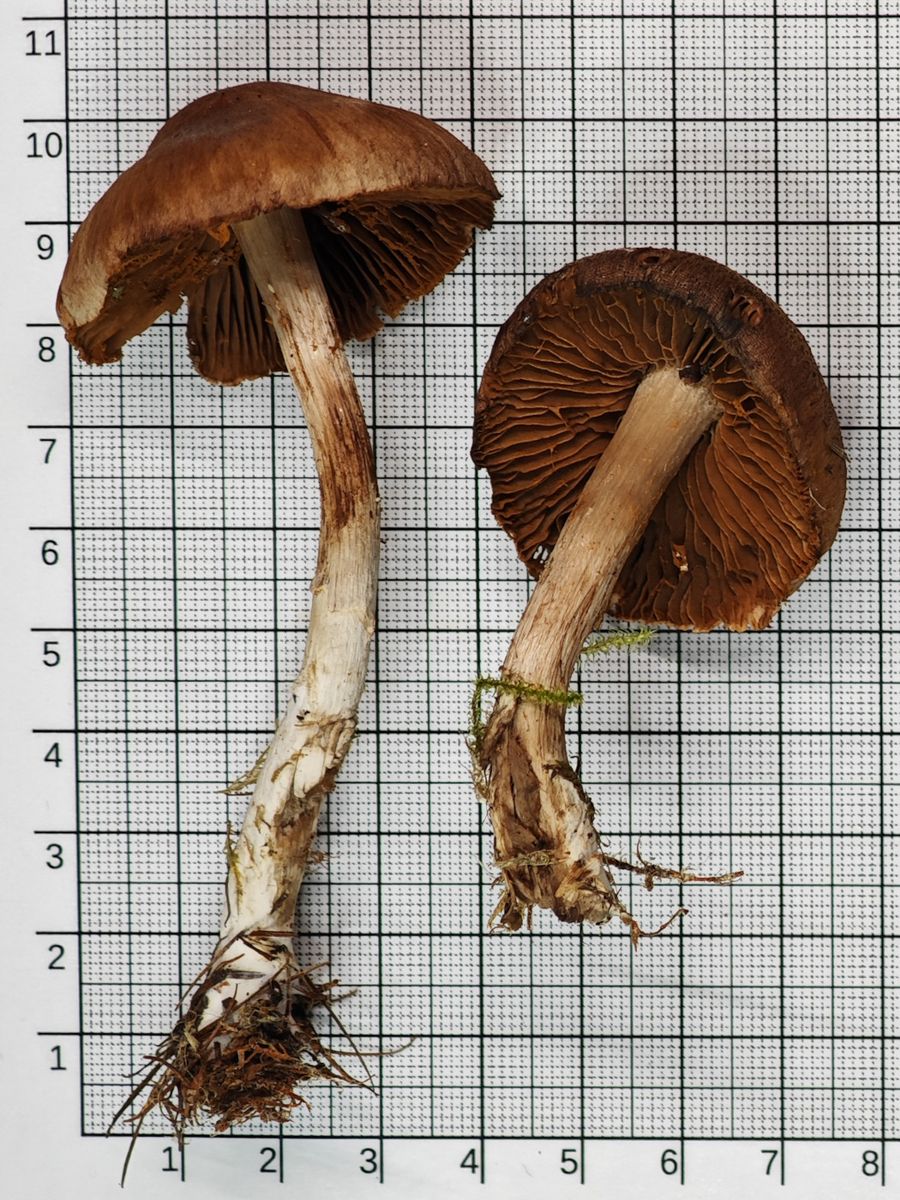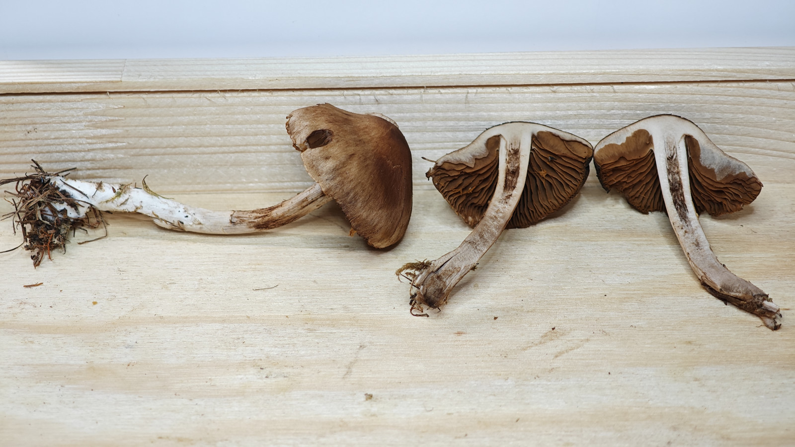 Vorgestern habe ich bei uns auf etwa 1800m bei Arve, Fichte und Lärche ein paar Telamonia gefunden. Was mich sofort erstaunt hat, war ein sehr angenehmer, süsslicher Duft. Mich erinnerte er irgendwie an Rosenblüten und ich dachte mir, den Duft könnte man direkt in einen Parfumflakon abfüllen, so angenehm roch es. Mir kam vor, dass der Geruch am intensivsten von den Lamellen ausging. Leider sind die Pilze nicht mehr die jüngsten, aber ich dachte mir mit diesem auffälligen Geruch müsste man doch etwas herausfinden. Ich habe dann mal mit FN geschlüsselt und am besten gefiel mir eigentlich Cortinarius niveotraganus, der aber eigentlich mit Birke wachsen sollte. Ansonsten habe ich mir noch C. agathosmus angeschaut, wo einige Merkmale auch passend scheinen.