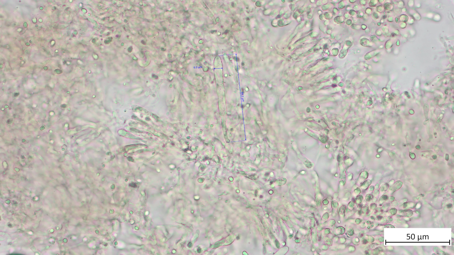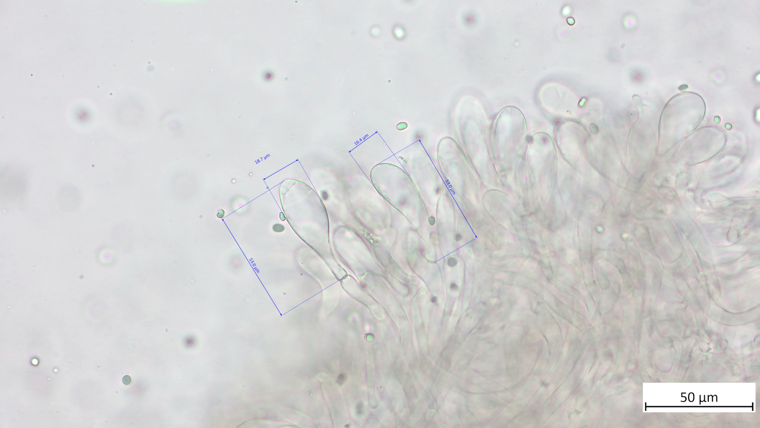 Die Cheilozystiden sind zwischen 31 und 82 µm lang und zwischen 14 und 25 µm breit: