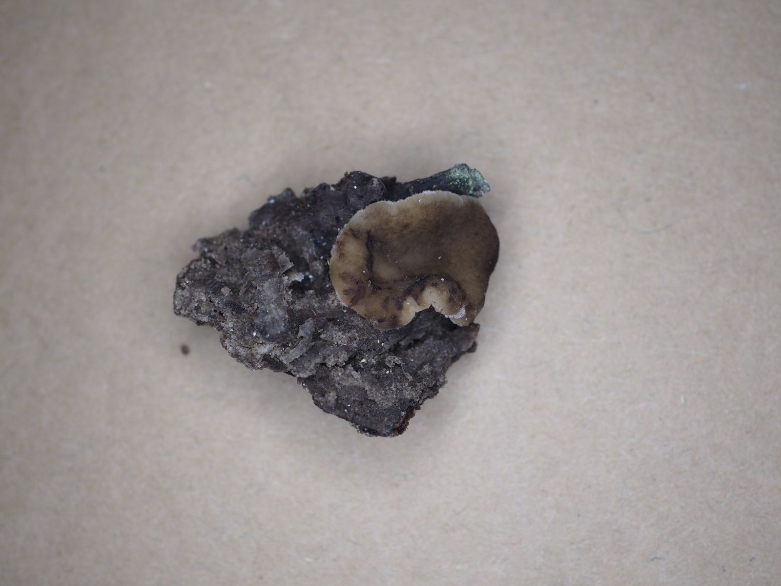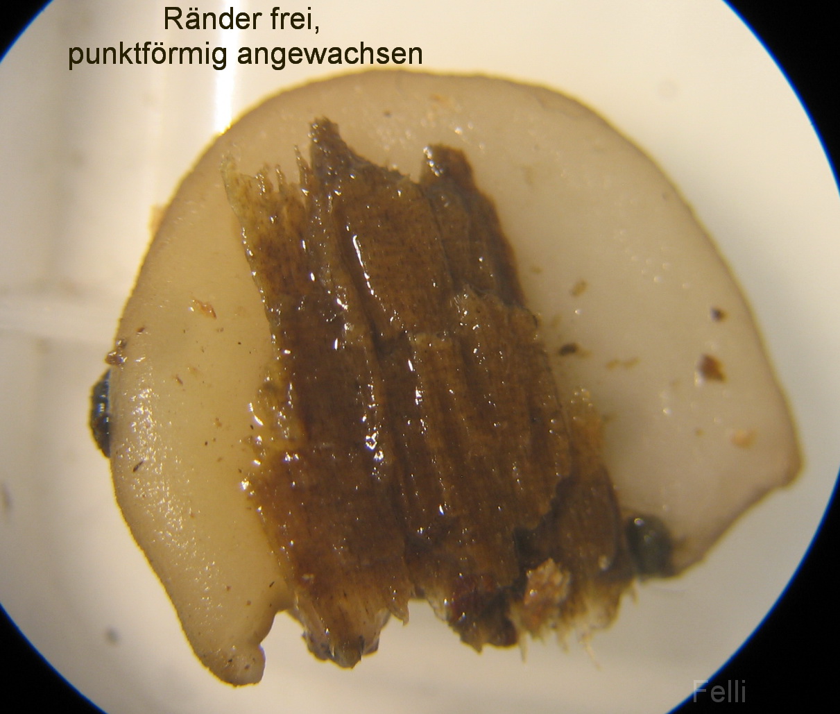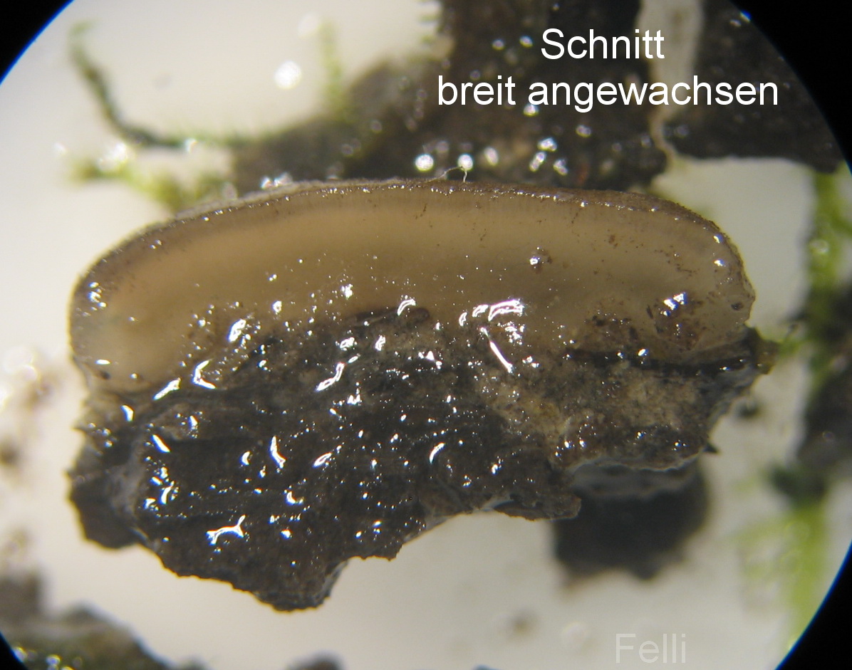 Der Pilz sitzt ganz auf dem Substrat, wie man hier im Schnitt schön sieht