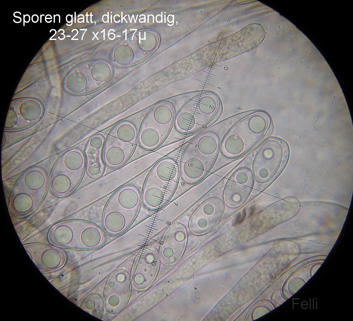 Die Sporen sind dickwandig, glatt , bi-guttulat, und sind recht groß