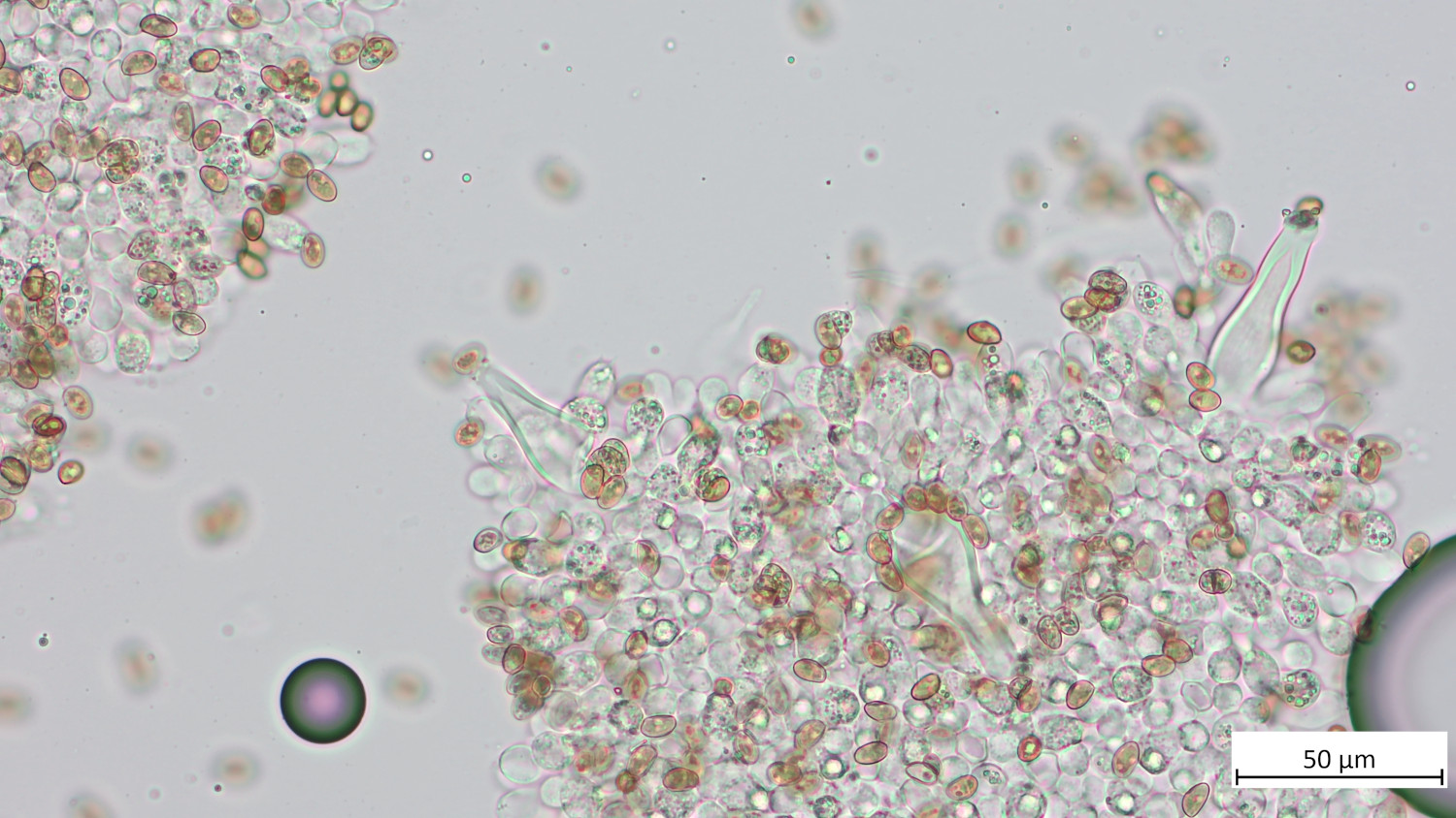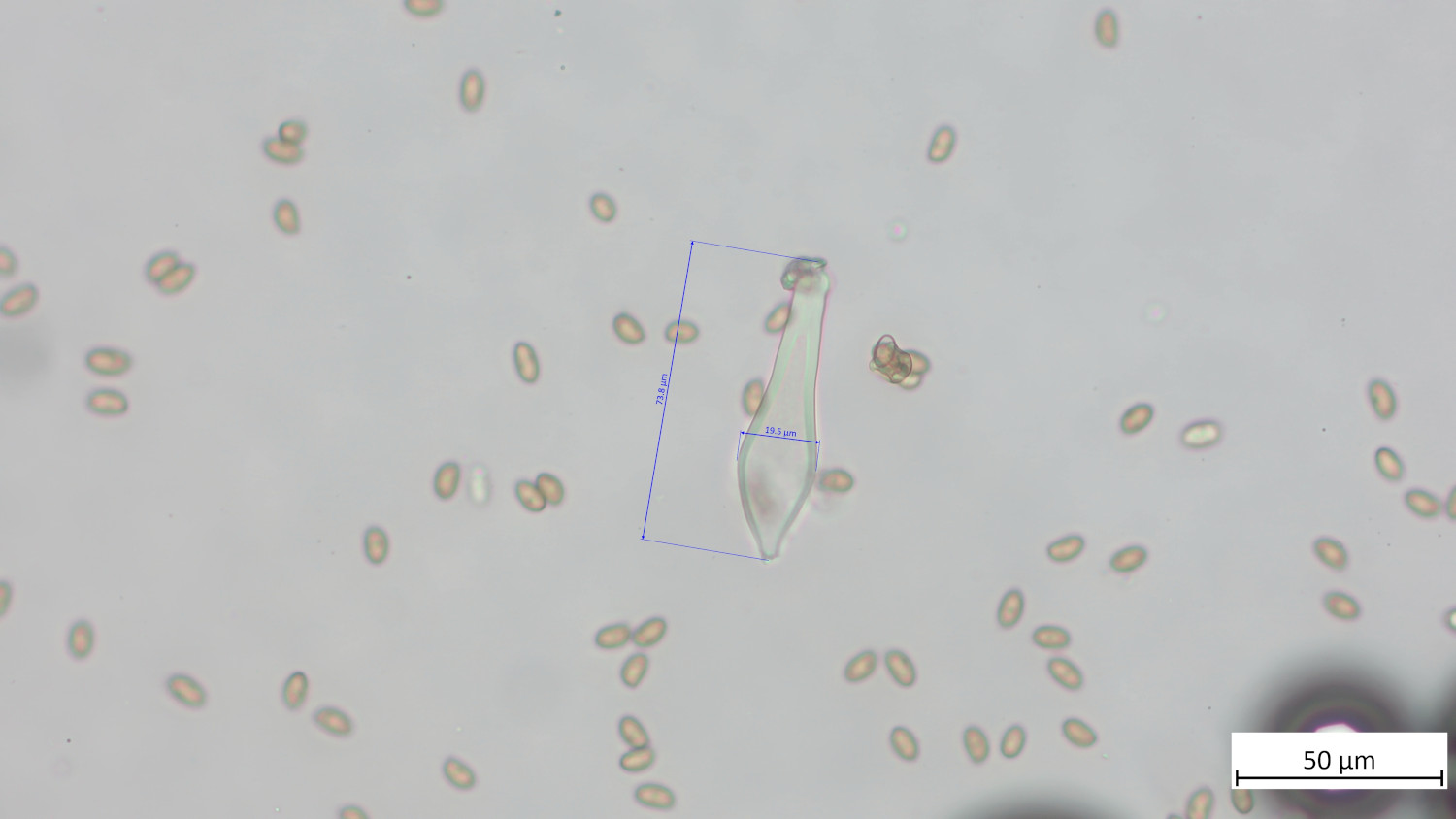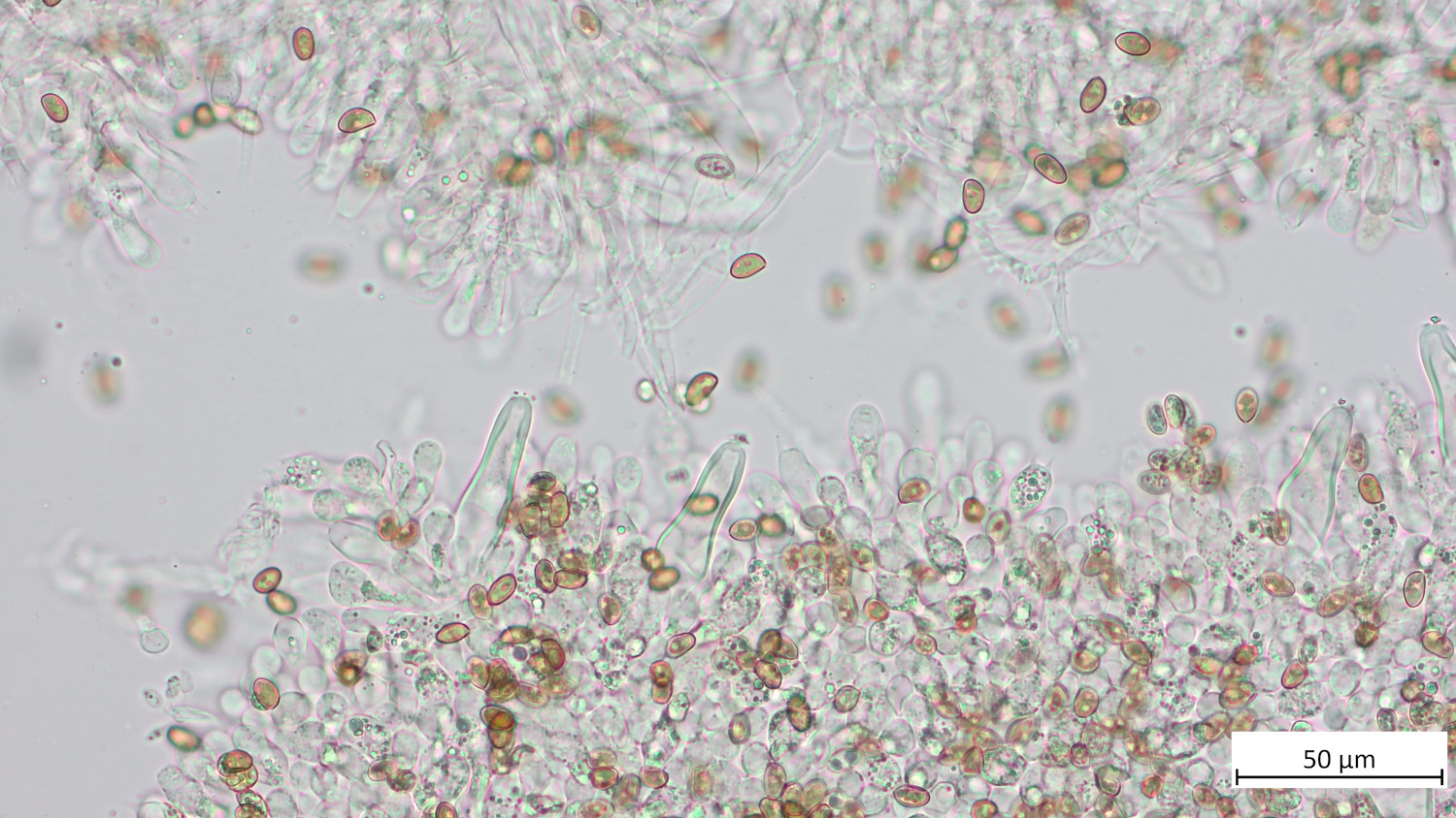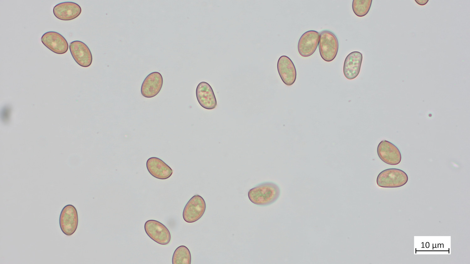 Sporen (29 gemessen): 9.0 µm (8.3–10.0 µm) × 5.6 µm (5.1–6.0 µm), Q = 1.62 (1.42–1.89)