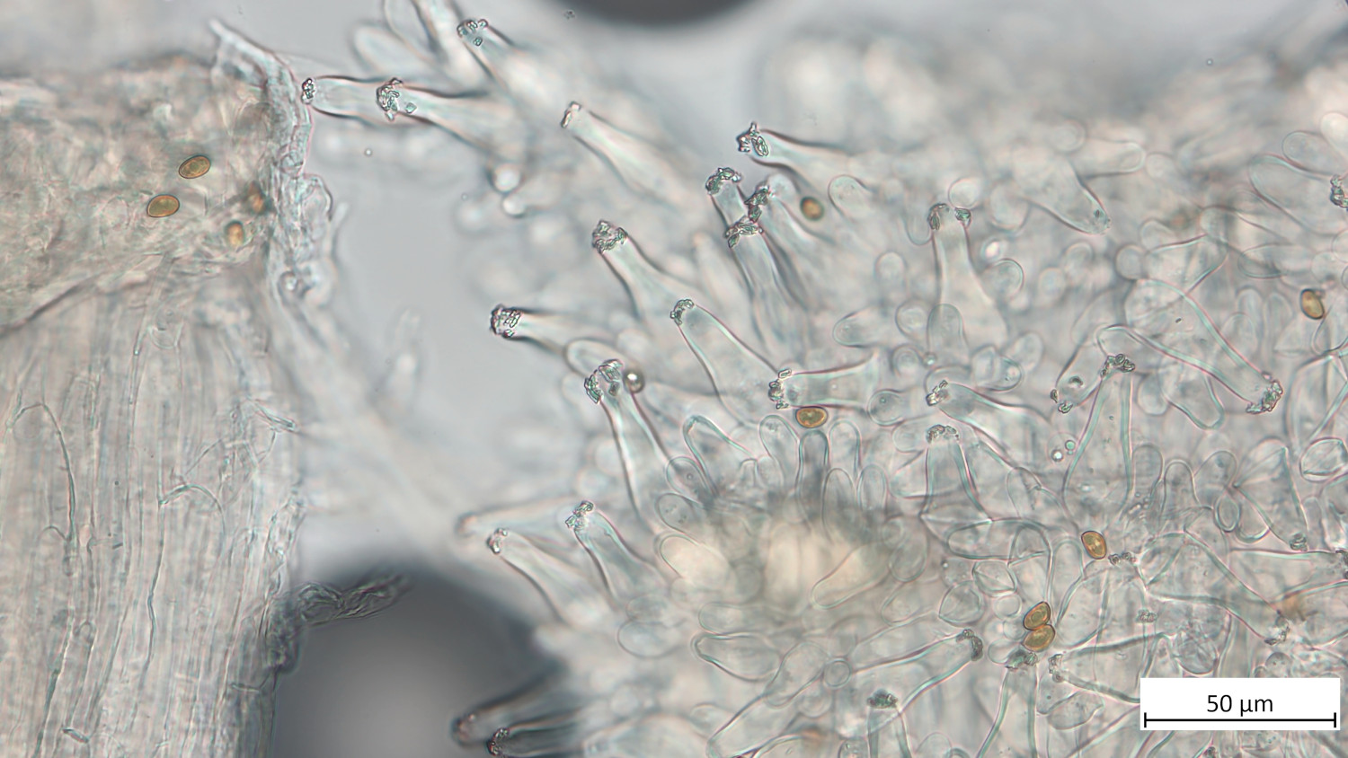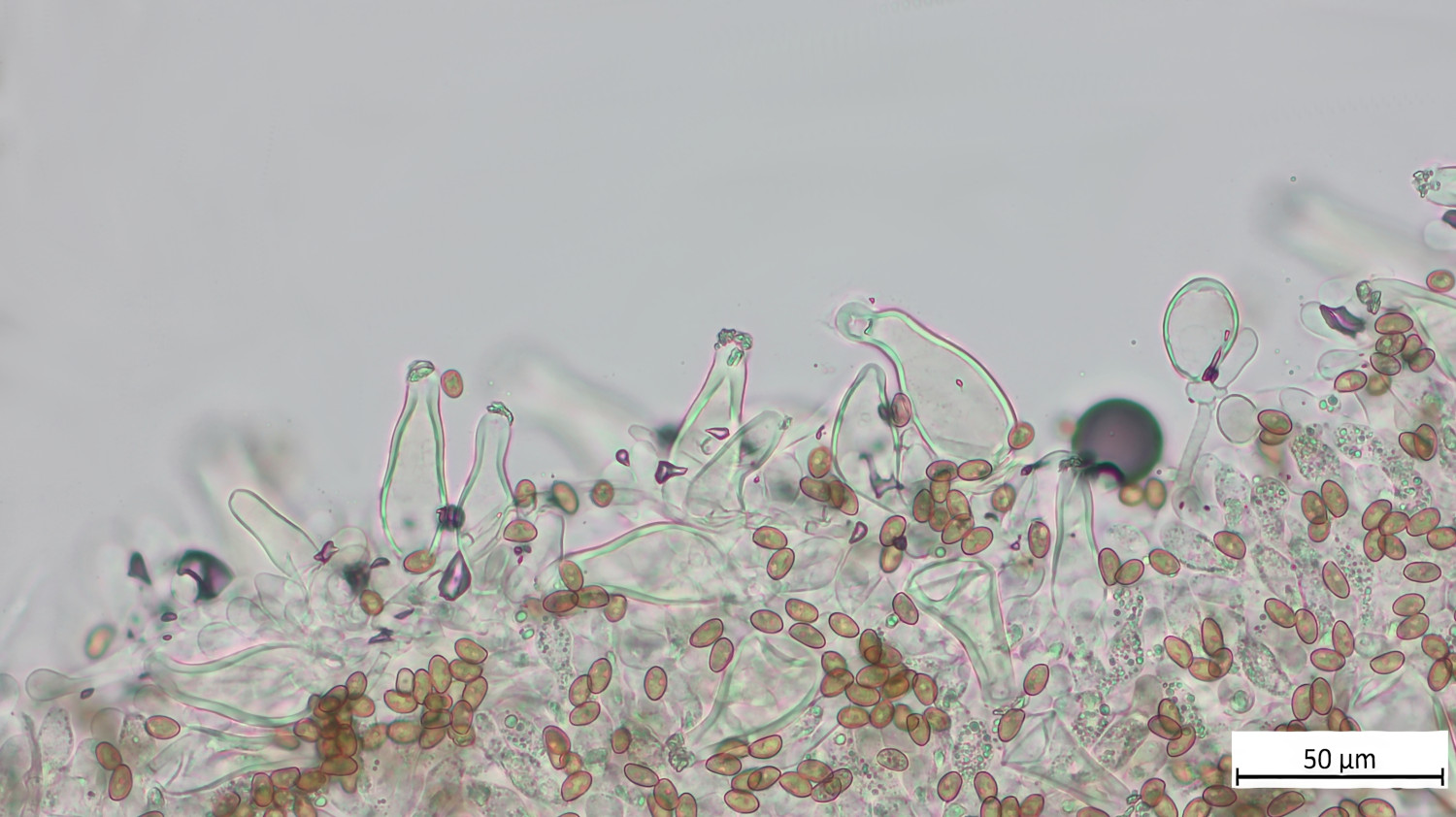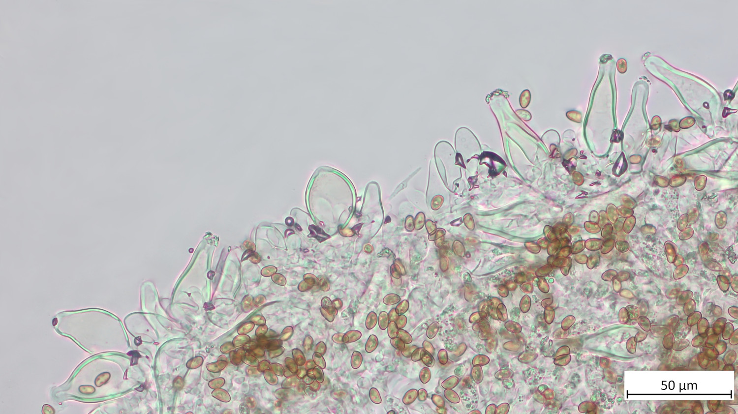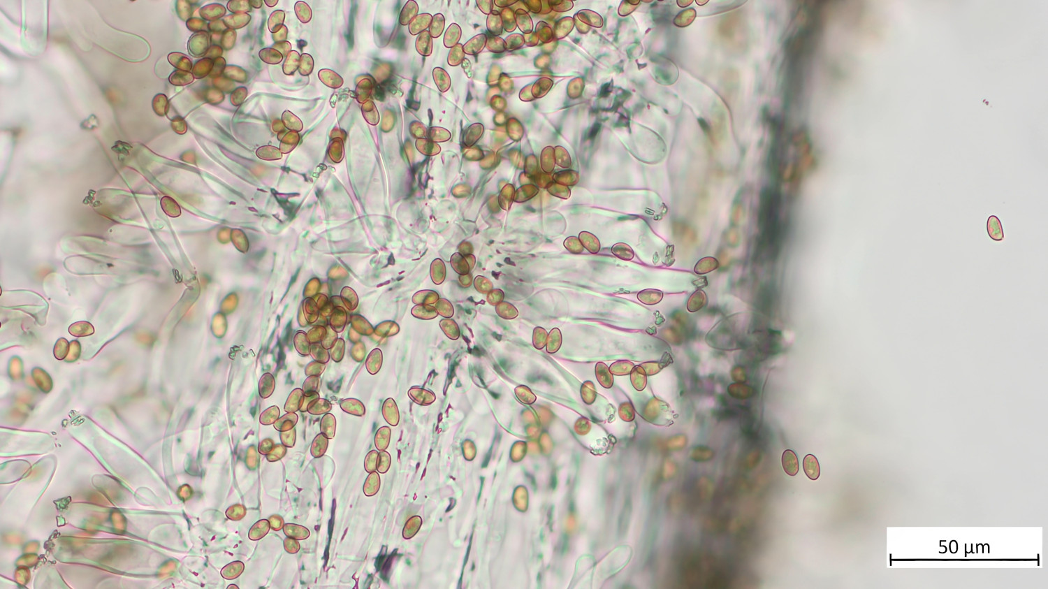 Sporen (29 gemessen): 9.0 µm (8.3–10.0 µm) × 5.6 µm (5.1–6.0 µm), Q = 1.62 (1.42–1.89)