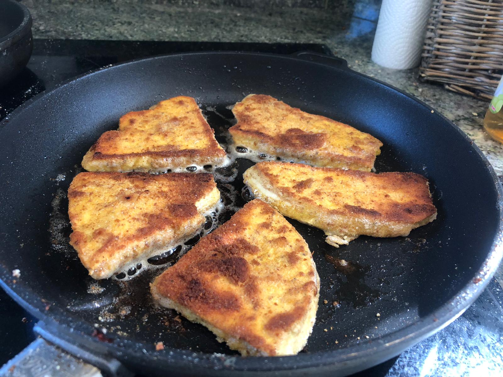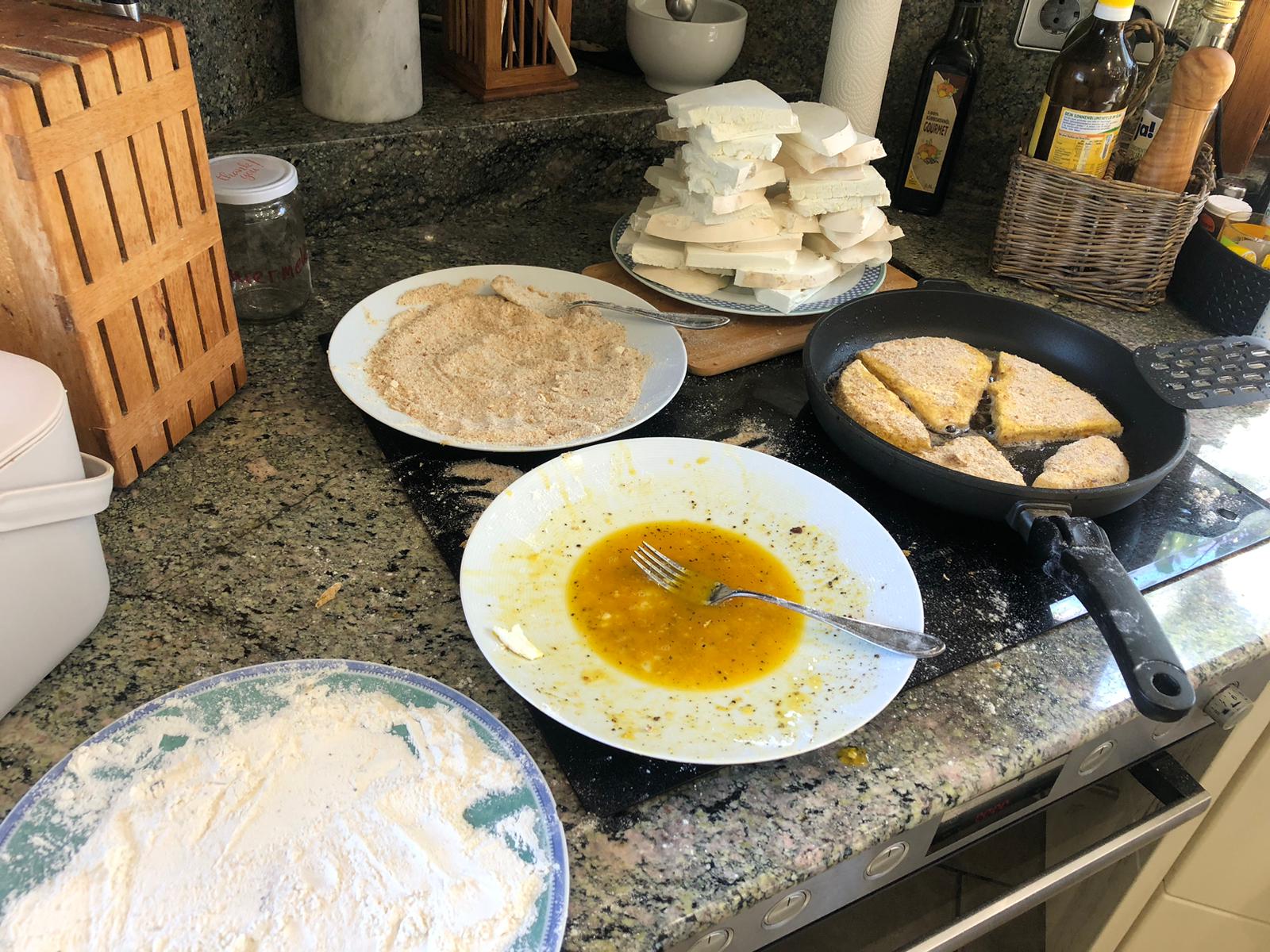 Mehl->Ei->Bretzelpaniermehl. Wir haben etwas herumprobiert und an Pilzstückstärken schmeckt uns am besten 1,3cm.