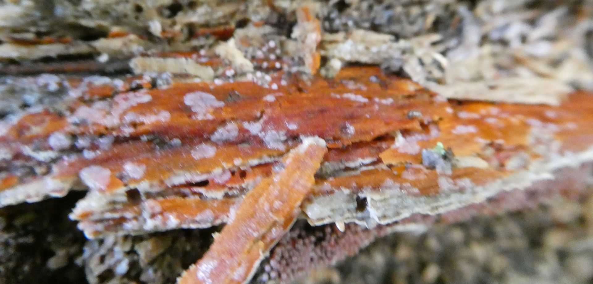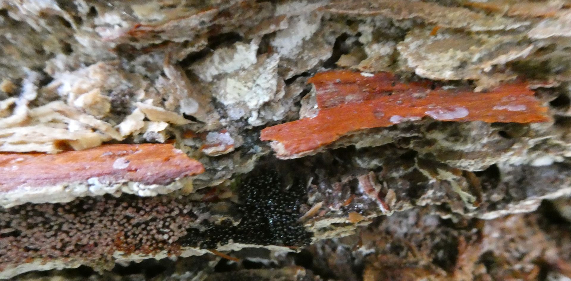 Oben vermutlich eine Fraßfront aus rostfarbenem "Glanzlack" das den Regen auffängt, drunter reifen rosa und schwarze Perlen-Konidien?