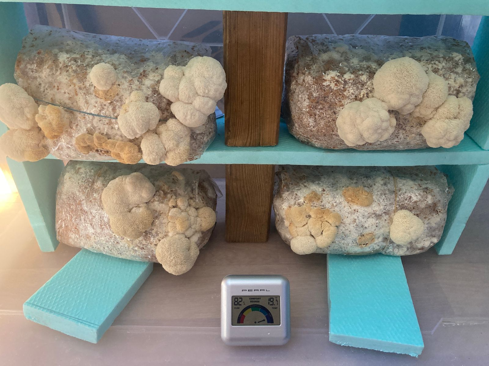 Meine Packungen sind schnell gefruchtet und dann habe ich mir etwas für die Luftfeuchtigkeit gebaut. Das besprühe ich mehrmals täglich (nicht direkt auf den Pilz) und Lüfte auch ab und zu am Tag (Decke die "Kammer" mit einer Folie ab, sodass es die Feuchtigkeit hält).