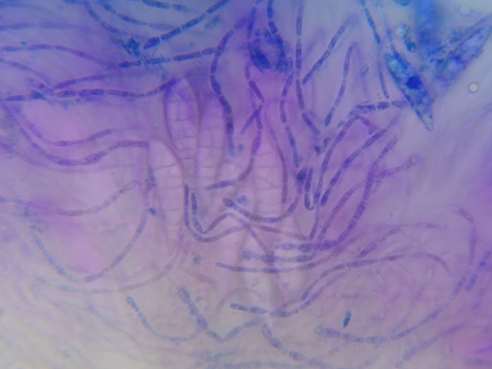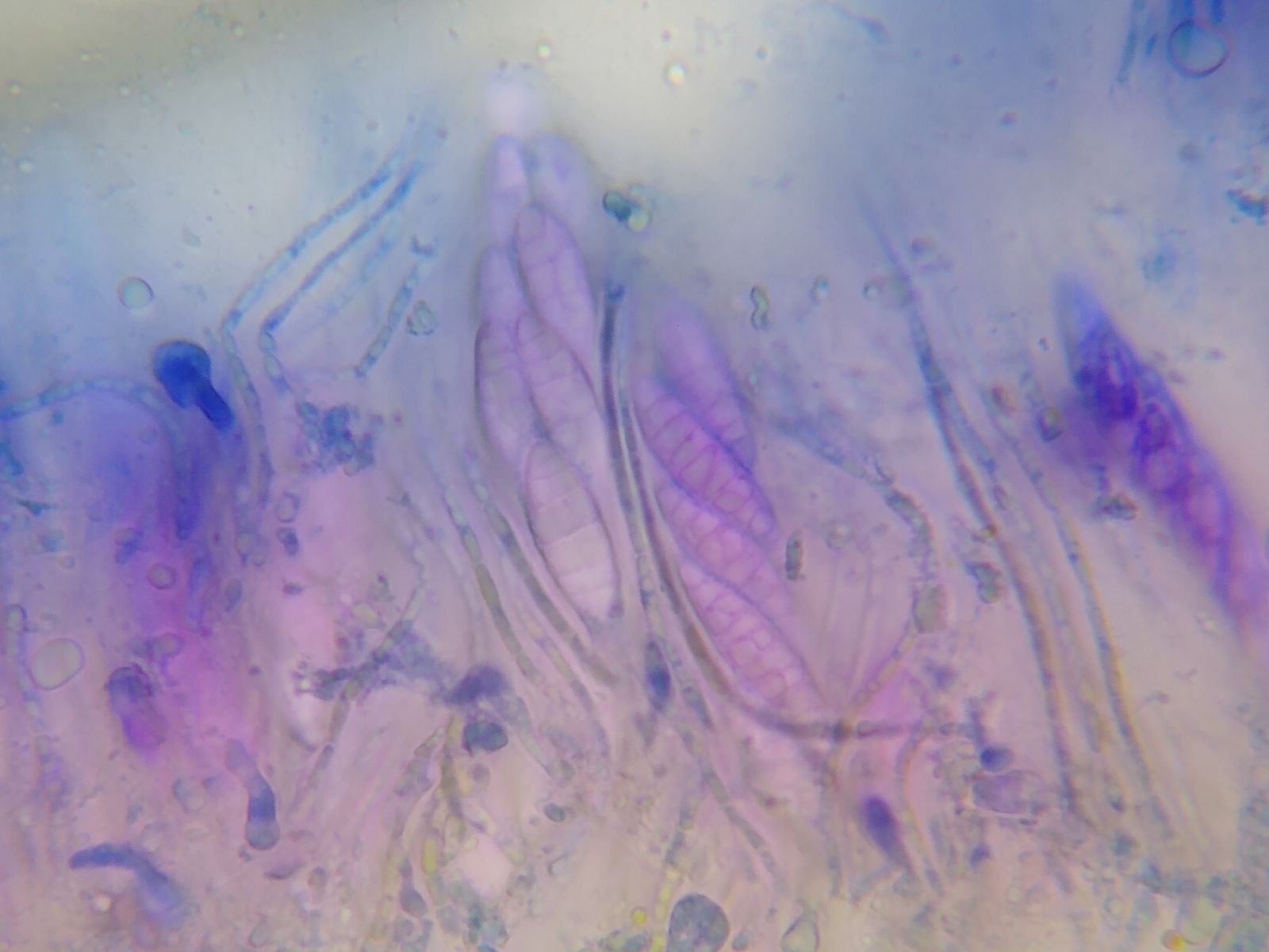 Letztlich habe ich das Hymenium und die Sporen eingefärbt, damit die Septierung der auch reif hyalinen Sporen besser erkennbar wird.