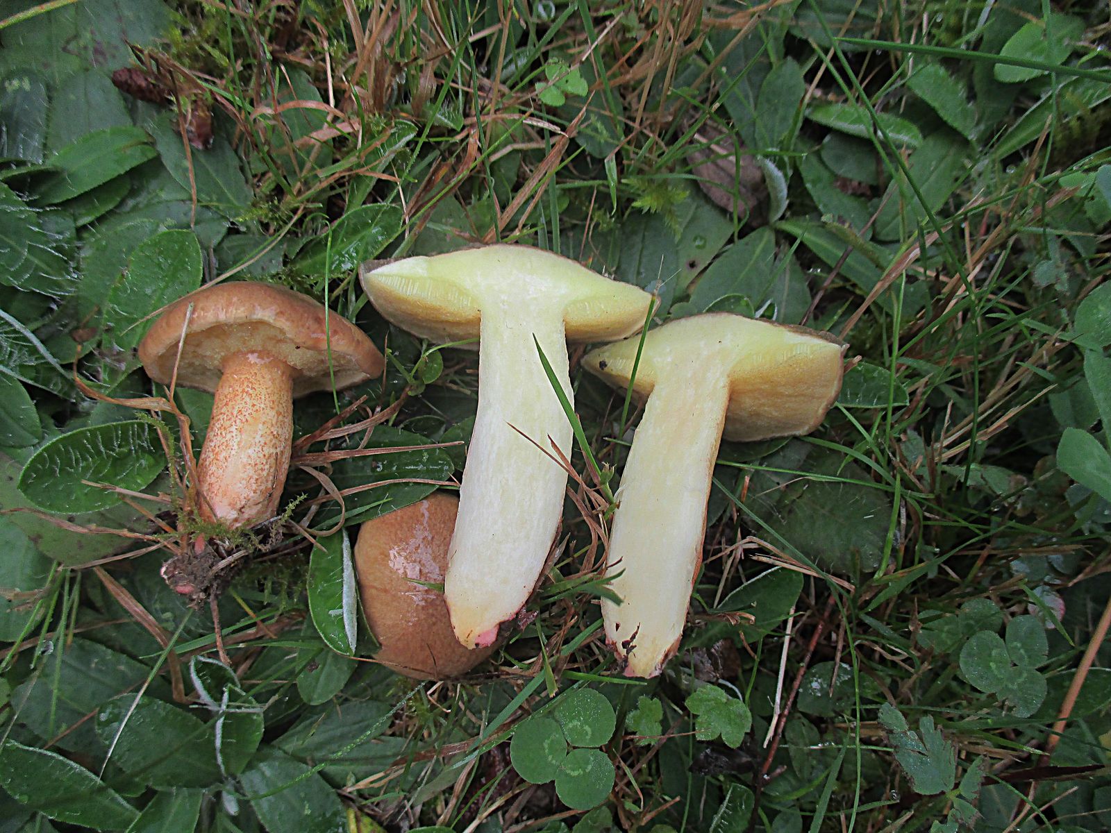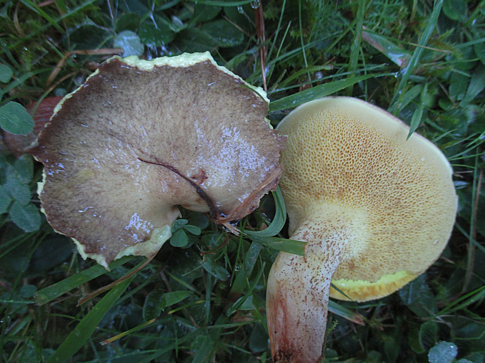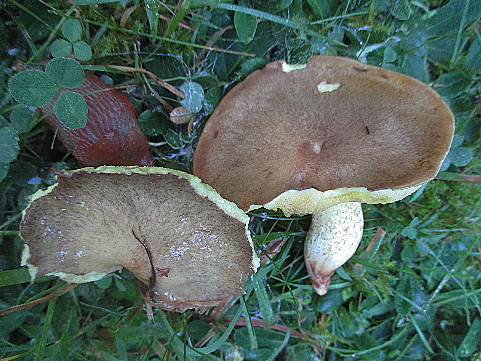 mir sind heute auf einer Rasenfläche zwischen einer zweinadeligen und einer fünfnadeligen Kiefer diese beiden Schmierröhrlinge begegnet bei denen ich wieder ins Grübeln komme weil nichts so recht passt.
