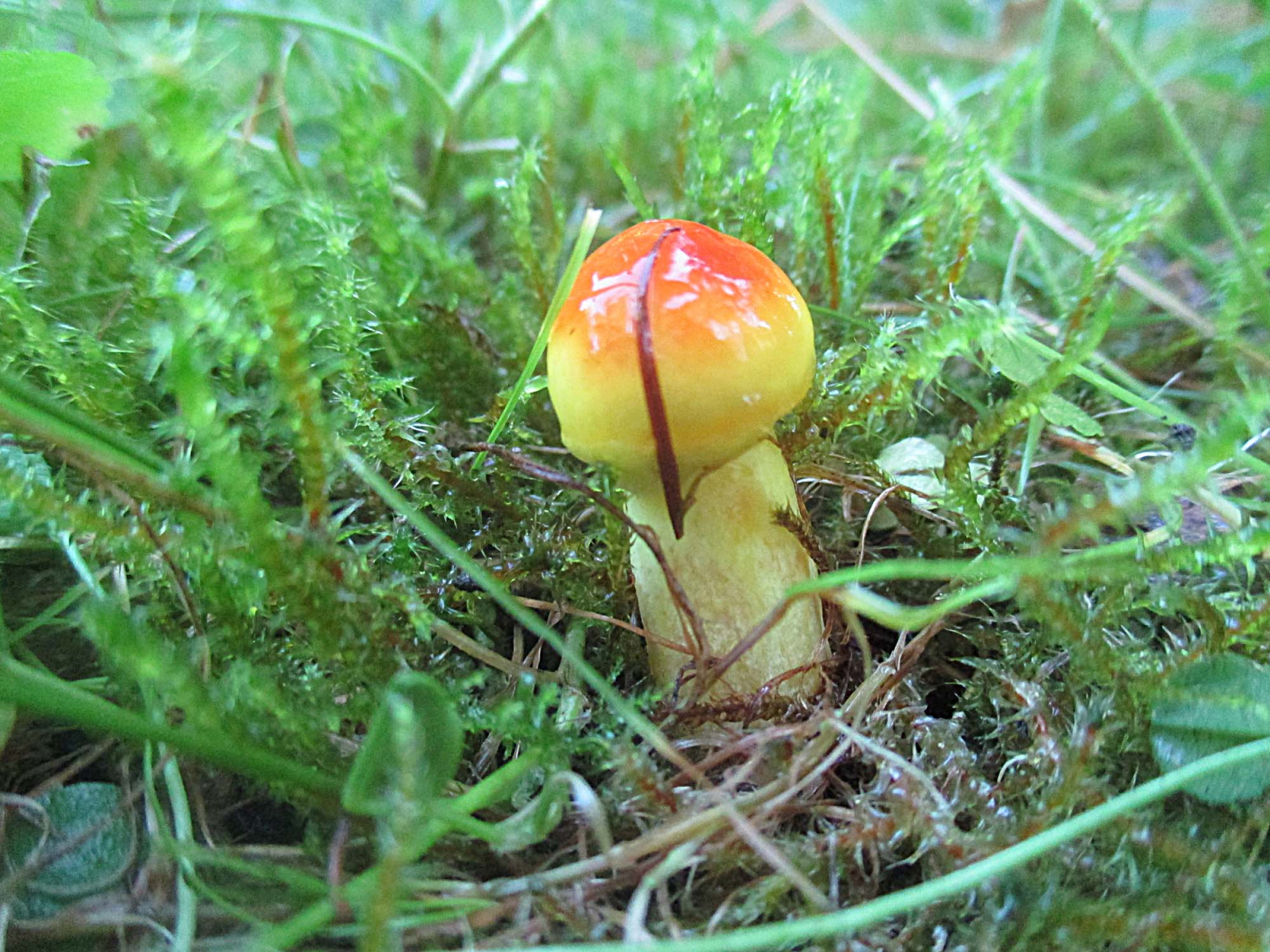 ein etwas deformiertes Exemplar von Cuphophyllus pratensis, den Orange-Ellerling,