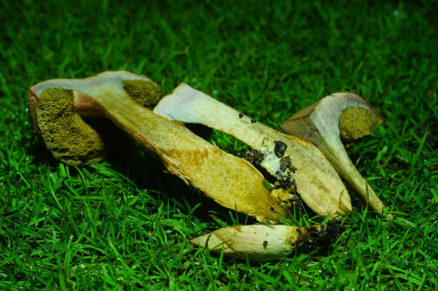Hilfreich wäre noch ein Schnittbild durch den gesamten Fruchtkörper inklusive Stielbasis. Dann auch nochmal zeigen ob es blau wird nach ein paar Minuten.