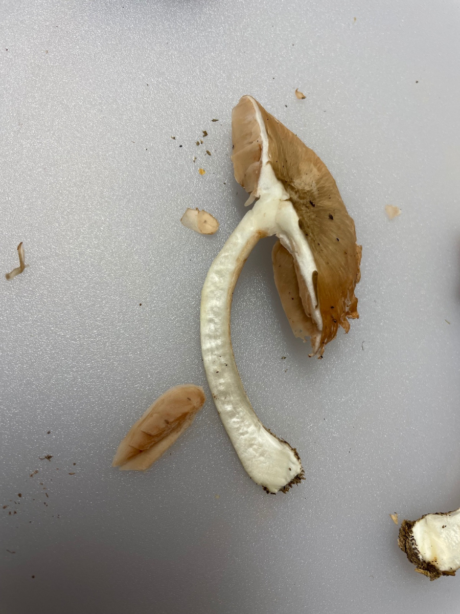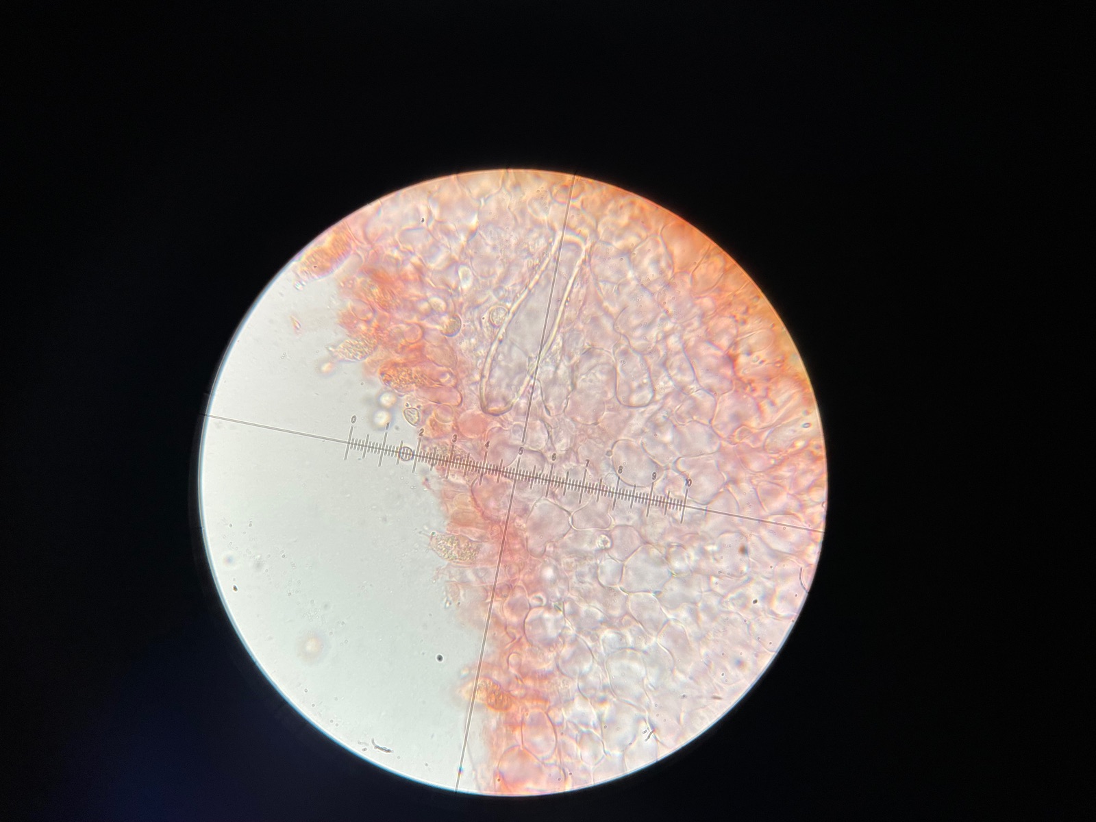wir haben heute in einem Moorkiefernwald an einer stehenden Birke in ca. 1,5 m Höhe diese zwei Fruchtkörper eines Dachpilzes gefunden. Ungewöhnliche Farbe und die Huthaut ist deutlich radialfaserig, aber eher wildlederartig-samtig, nicht glatt, speckig. Unterm Mikroskop nur liegende Hyphen, einige leicht hochstehend, keine Pileozystiden erkennbar.