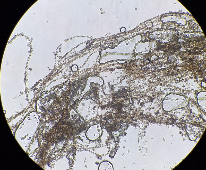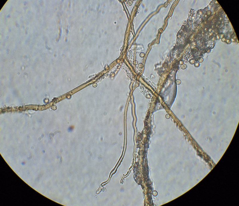 daher in Wasser, Sporen 4-4,5 µm dick feinwarzig (in Luftblase besser erkennbar), tels mit kurzem Sterigmenrest, Hyphen gelb - Verzweigung oder Septen habe ich nicht gefunden [die Probe stammt allerdings von oben kurz unter der Hülle - das sieht vielleicht anders aus, wenn man tiefer stochert oder ein vollreifes Exemplar nimmt], 3-4 µm dick, gelegentlich mit Poren, relativ "dickwandig". Daneben noch transparente Hyphen.