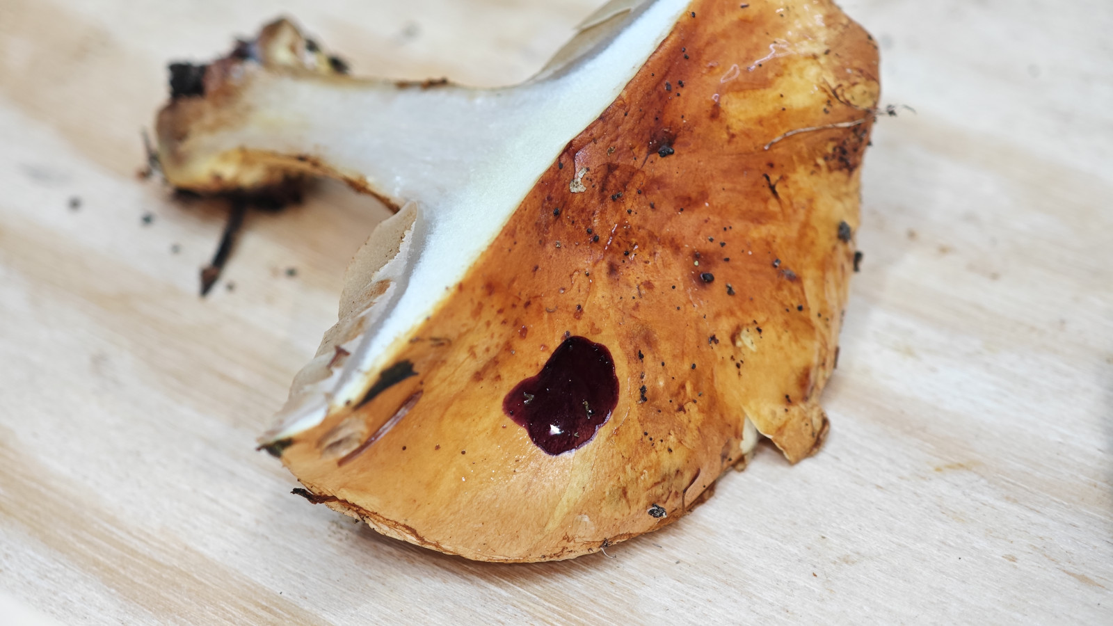 So wie es bei mir war. Da wo das Fleisch komplett weiss war, war die Reaktion negativ, sonst hellrötlich. Ich habe bei mir KOH 30% verwendet. Vielleicht hätte ich den jüngeren FK (der im Hut weisser ist) auch noch testen sollen. Ich könnte mir vorstellen, dass dieser etwas weniger stark reagiert hätte. Die sind jetzt aber leider schon fast getrocknet und ich habe nur noch die Hälfte des grossen FK im Kühlschrank.