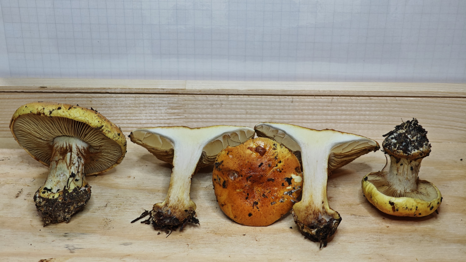 Erstmal vielen Dank für die Antwort. Es sind aber auf allen Fotos die Pilze zu sehen, die auf dem ersten Foto abgebildet sind und die wuchsen als Gruppe zusammen. Für mich sah die Hutfarbe auch bei allen identisch aus. In der Mitte oranglich und zum Rand hin gelblich mit Grünstich, den man vor allem am jüngsten Exemplar gut gesehen hat. Ich dachte das passt optimal zur Beschreibung im Ludwig, da er beim Hut die Cortina mit blass grüngelb beschreibt. Leider ist es nicht immer ganz einfach die Farben auf den Fotos ganz korrekt wiederzugeben. Auch kommt es mir vor, dass sie hier im Forum anders sind, als bei mir, obwohl es das gleiche Foto sein müsste. Vielleicht liegt es am Farbprofil, das beim Hochladen entfernt wird? Hier habe ich noch ein Foto von allen Hüten nebeneinander. Bei mir sieht das Zentrum orangener aus, als hier im Forum, obwohl es das gleiche Foto ist: