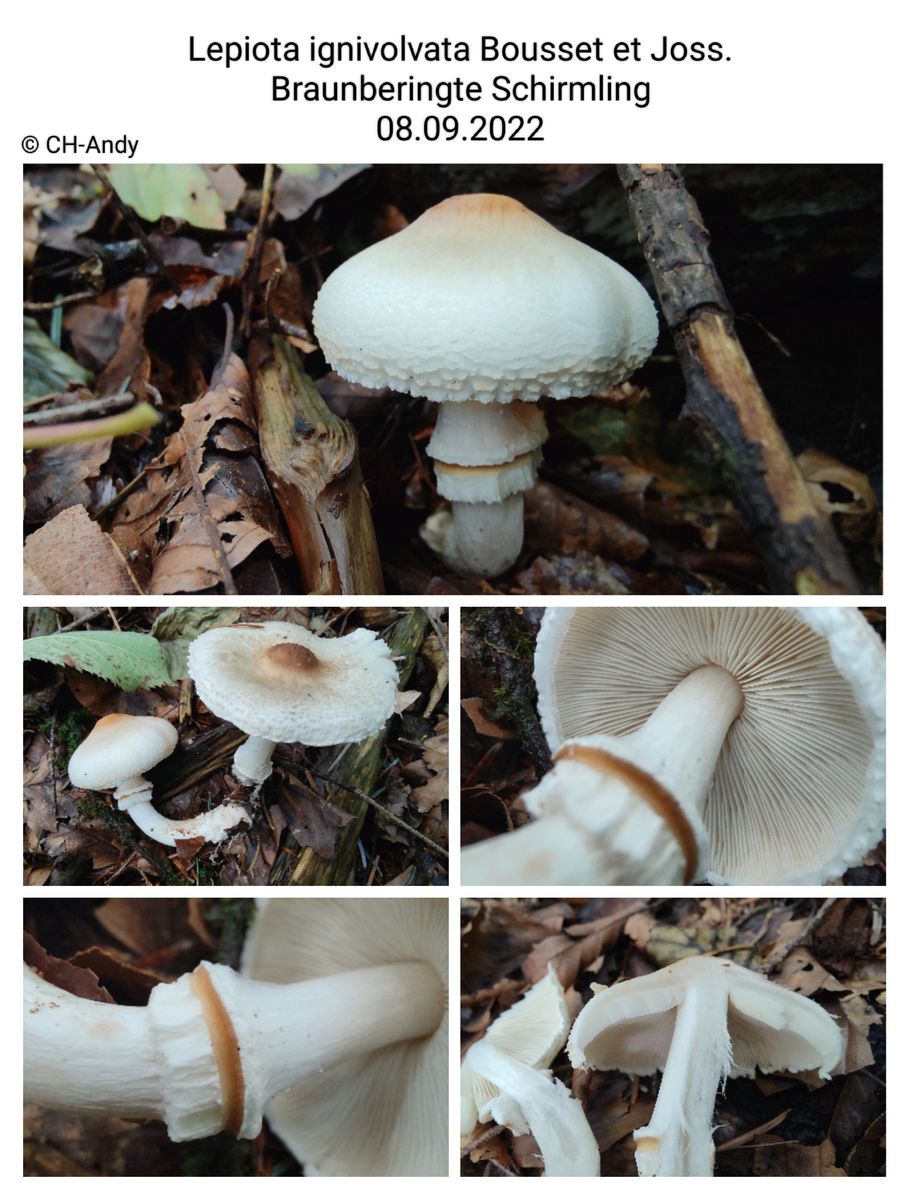 Der größte ist etwa 13 cm hoch, Hut weiß mit recht feinen, bräunlichen Flocken, in der Mitte ein brauner Gupfen. Lamellen weiß und frei. Stiel beim größten fast 1,5 cm dick, weiß, unterhalb des Ring fransig (leider jetzt schon nicht mehr so gut zu sehen), Ring recht vergänglich, es sind aber Reste einer doppelten, braunen Struktur erkennbar (auf dem zweiten Bild zu sehen). Das größte Exemplar hat sich am Fuß bei Reibung orangebraun verfärbt (auf dem ersten Bild zu erahnen). Bei den kleineren war selbst bei vorsichtigem Reiben sofort die oberste Schicht ab, sodass ich keine Verfärbung feststellen konnte.