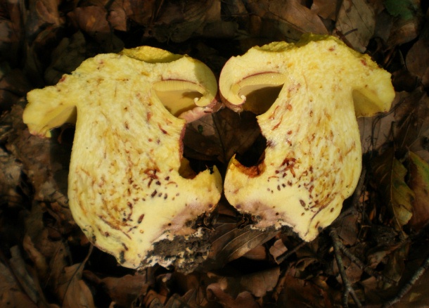 diesen, schon etwas mitgenommenen, Röhrling habe ich in einem Eichen- Buchenwald gefunden. Die gelbe Farbe des Stiels und die rosarote Hutfarbe weisen auf einen Königsröhrling (Boletus regius) hin, oder ist es doch eine andere Art?