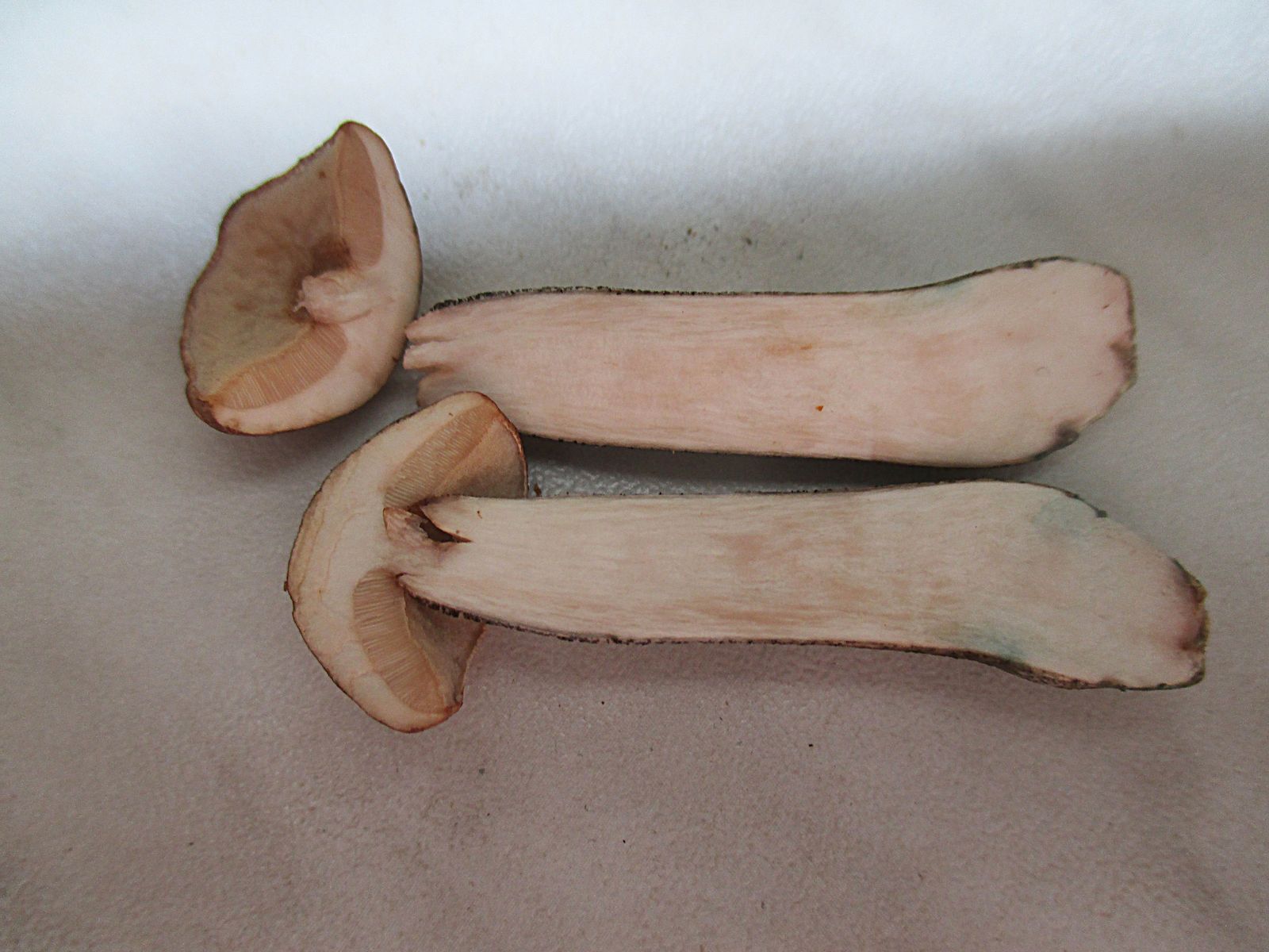 Als ich mit dem Fund nach circa einer Stunde Zuhause ankam, konnte ich an der Stielbasis ganz schwach gelb-bläuliche Verfärbungen feststellen und kam ins Zweifeln. Der Querschnitt gab dann Aufschluss: Eine kleine Stelle an der Stielbasis, direkt am Rand, bläute. Weil ich aus Kibby, 2016, p. 68 im Kopf hatte, dass Leccinum scabrum nie bläut, verglich ich den Fund mit anderen Arten, aber:
