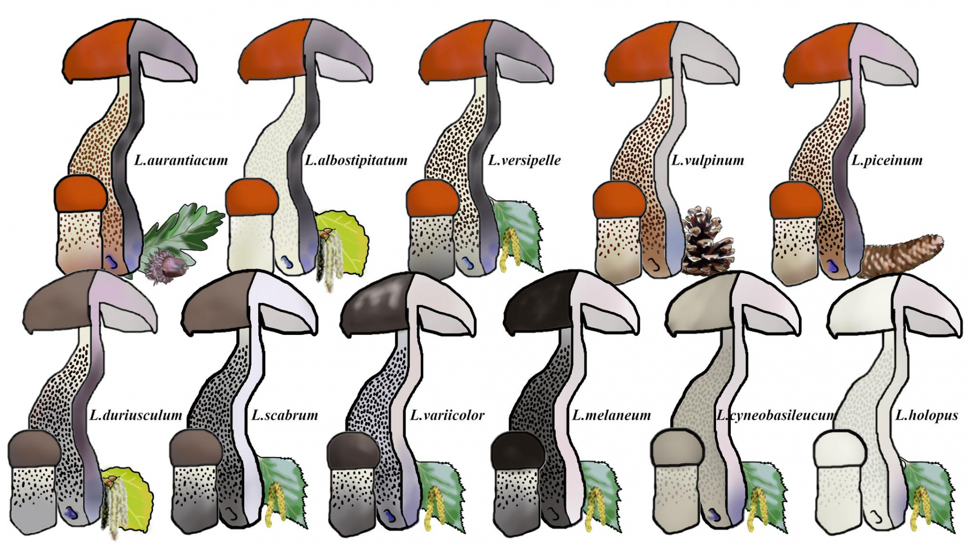 • andere Arten der Gattungen Leccinum oder Leccinellum sind mit anderen Baumpartnern als Betula vergesellschaftet.