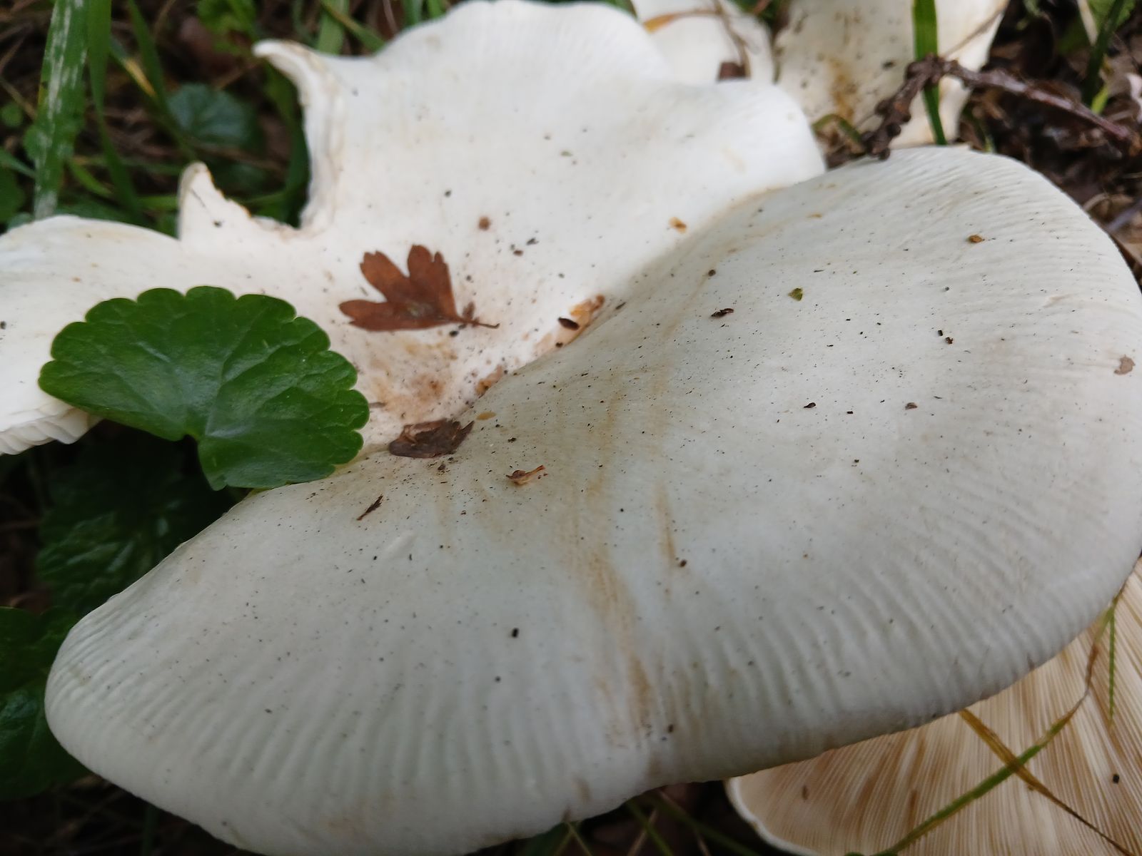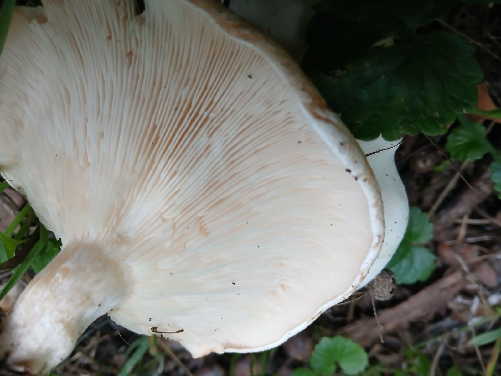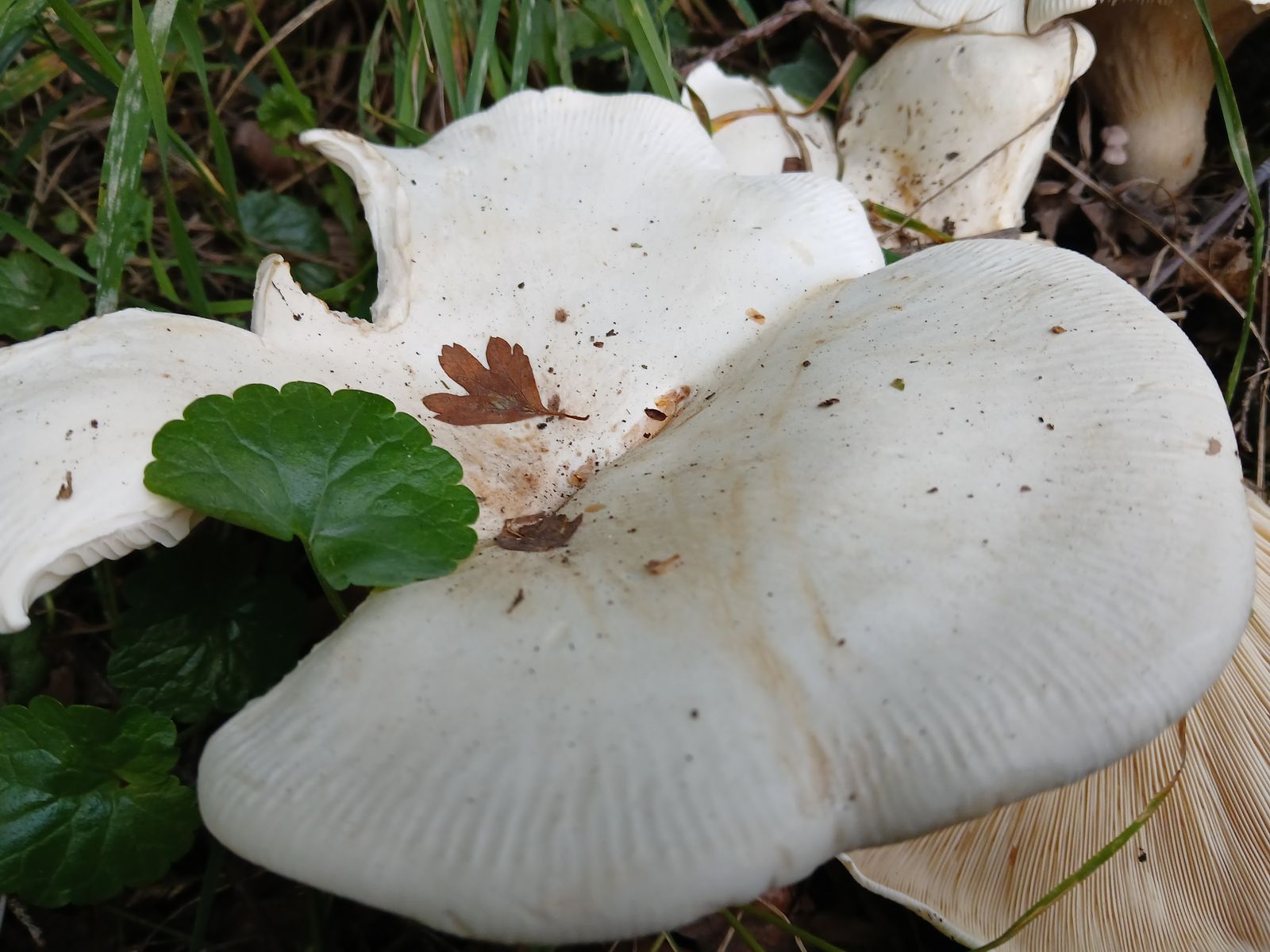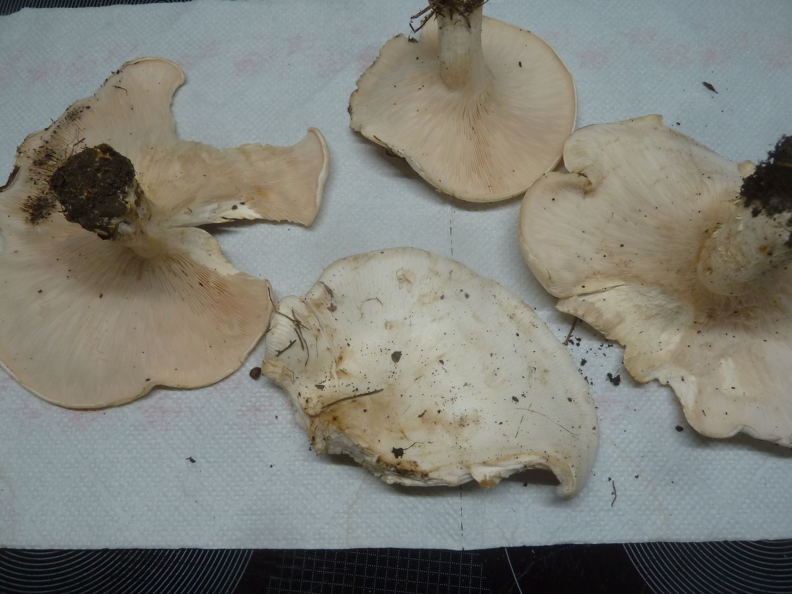 Ich würde diese Exemplare bei den Trichterlingen/Leucopaxillus verorten, könnten das etwas klein geratene Exemplare vom Riesenkrempentrichterling sein?